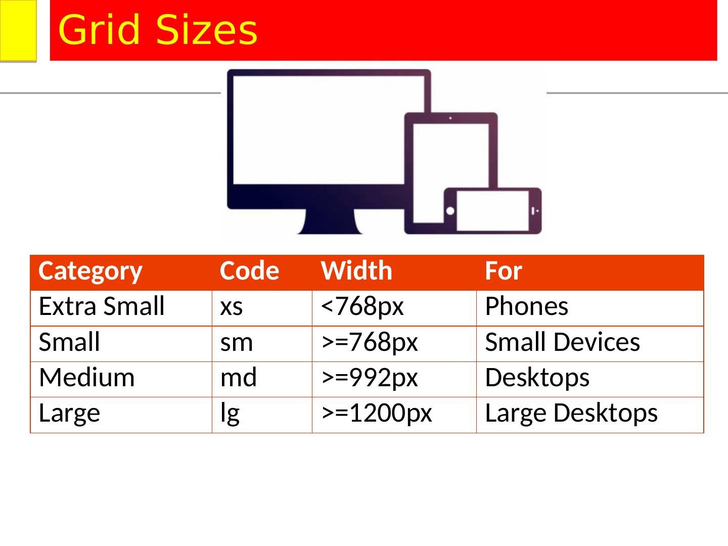8 .Category Code Width For Extra Small xs <768px Phones Small sm >=768px Small Devices Medium md >=992px Desktops Large lg >=1200px Large Desktops Grid Sizes