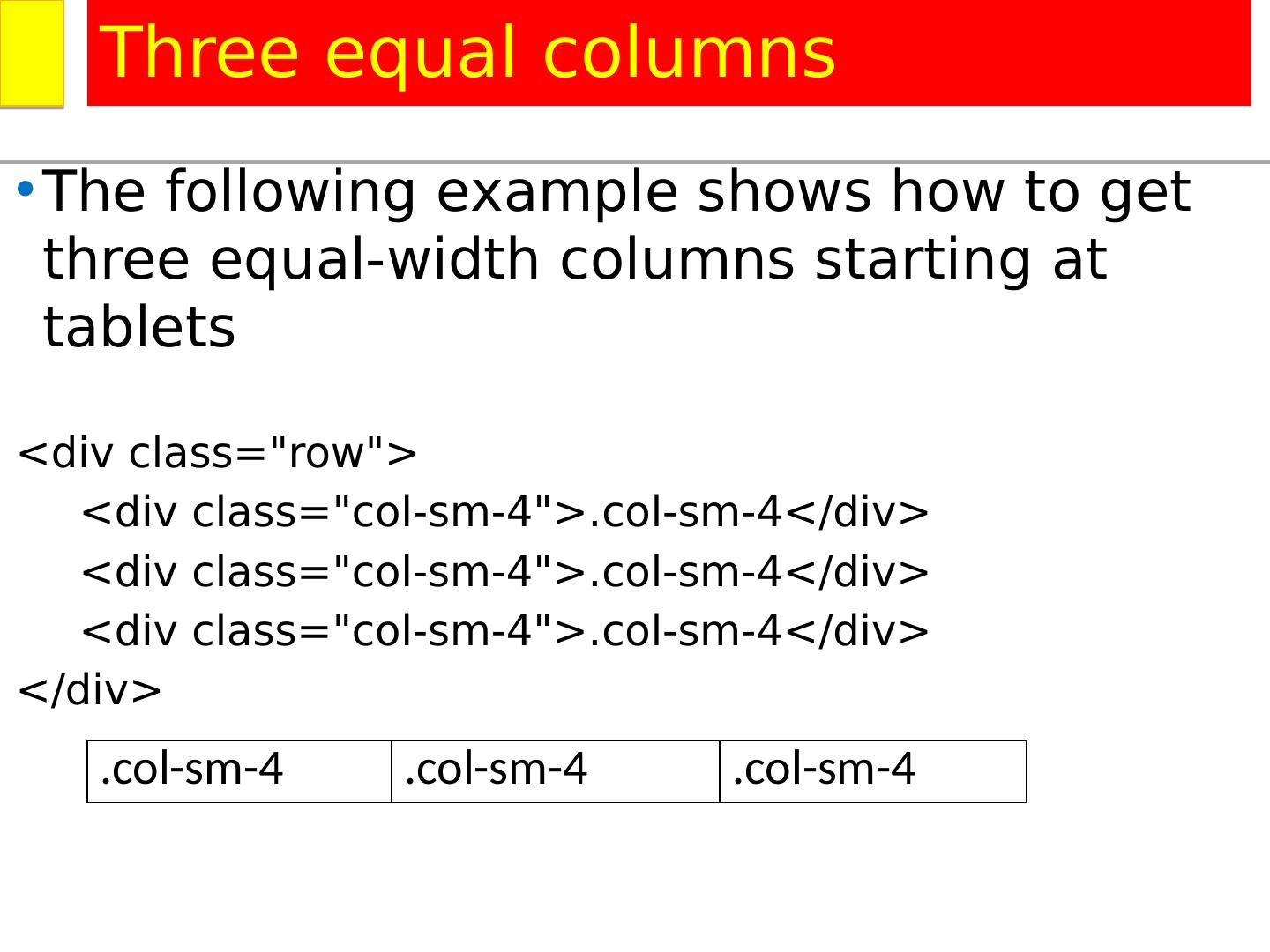 9 .The following example shows how to get three equal-width columns starting at tablets < div class="row"> < div class="col-sm-4">.col-sm-4</div> < div class="col-sm-4">.col-sm-4</div> < div class="col-sm-4">.col-sm-4</div> </div > Three equal columns .col-sm-4 .col-sm-4 .col-sm-4