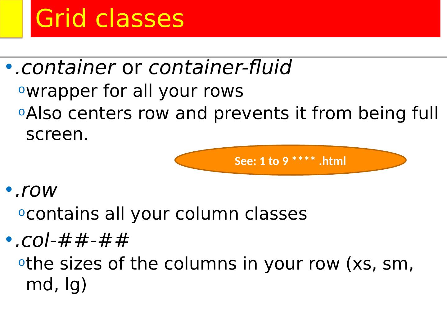 12 ..container or container-fluid wrapper for all your rows Also centers row and prevents it from being full screen. .row contains all your column classes .col-##-## the sizes of the columns in your row ( xs , sm , md, lg ) Grid classes See: 1 to 9 **** .html