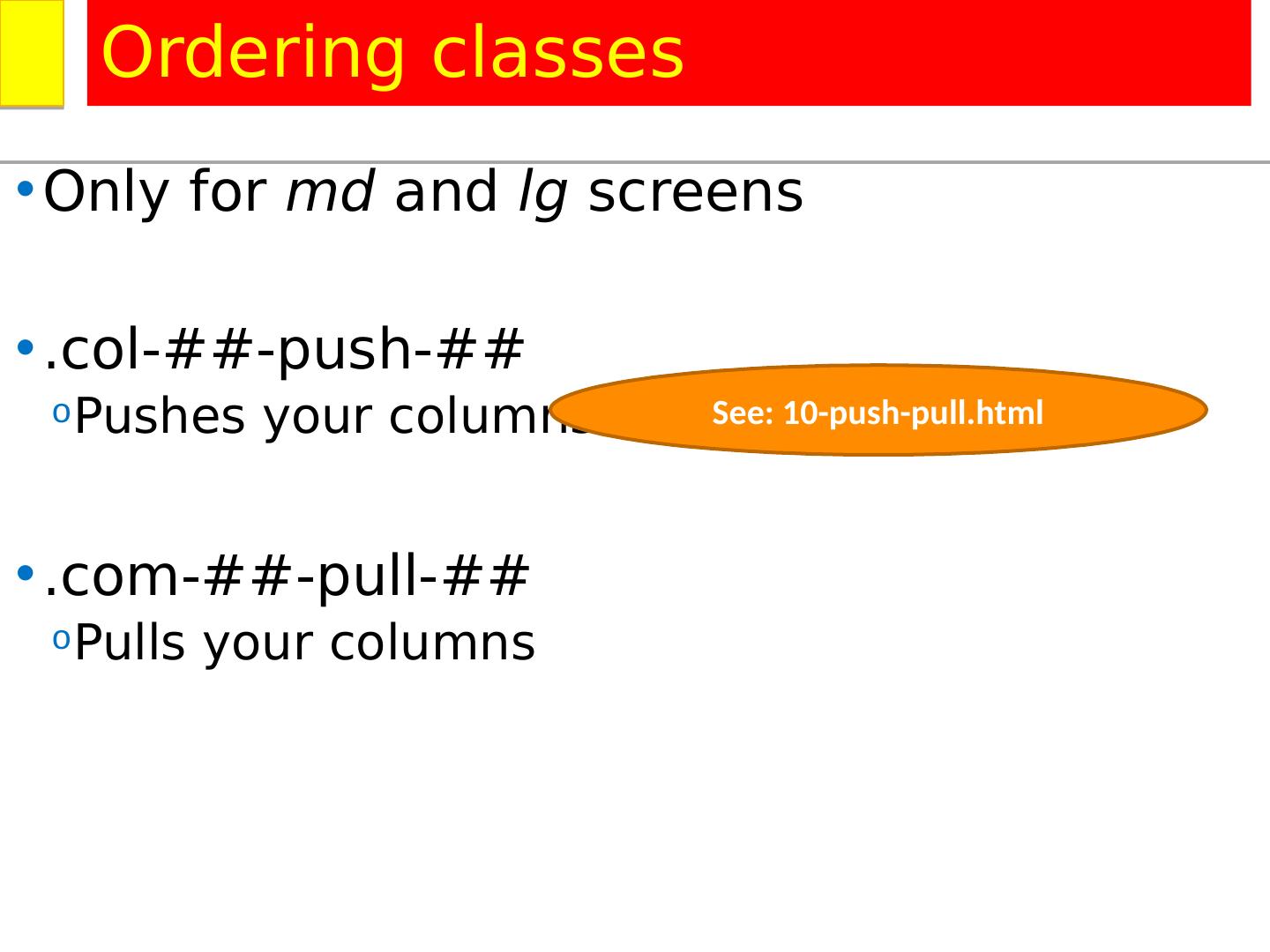 13 .Only for md and lg screens .col-##-push-## Pushes your columns .com-##-pull-## Pulls your columns Ordering classes See: 10-push-pull.html