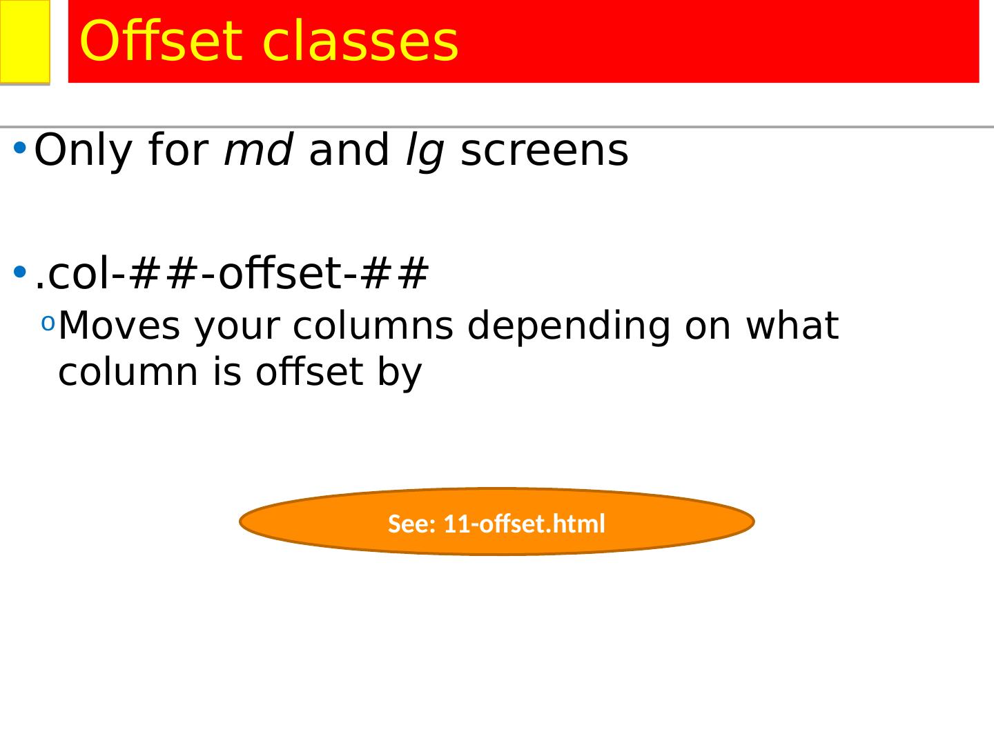 14 .Only for md and lg screens .col-##-offset-## Moves your columns depending on what column is offset by Offset classes See: 11-offset.html