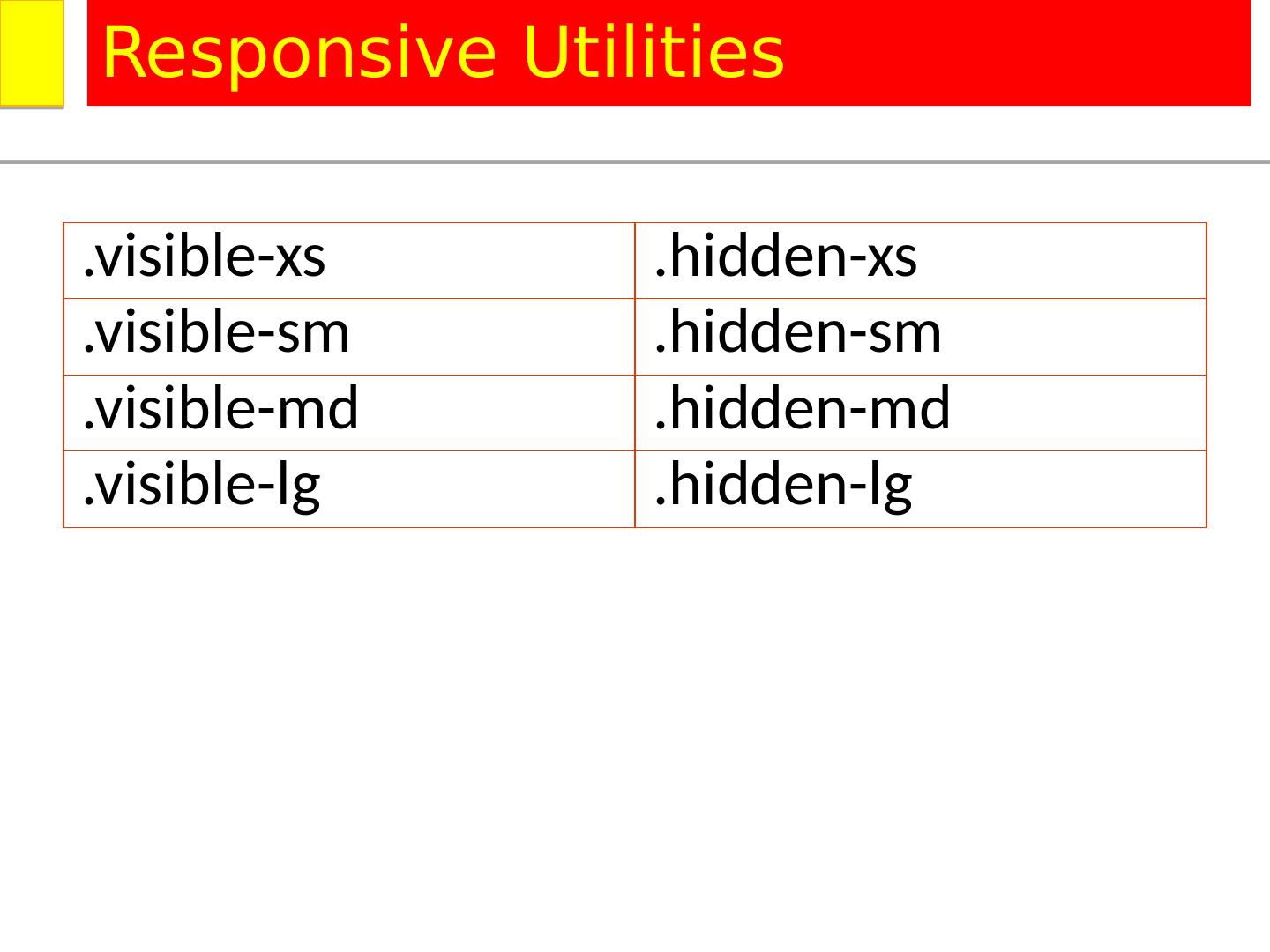 15 ..visible- xs .hidden- xs .visible- sm .hidden- sm .visible-md .hidden-md .visible- lg .hidden- lg Responsive Utilities