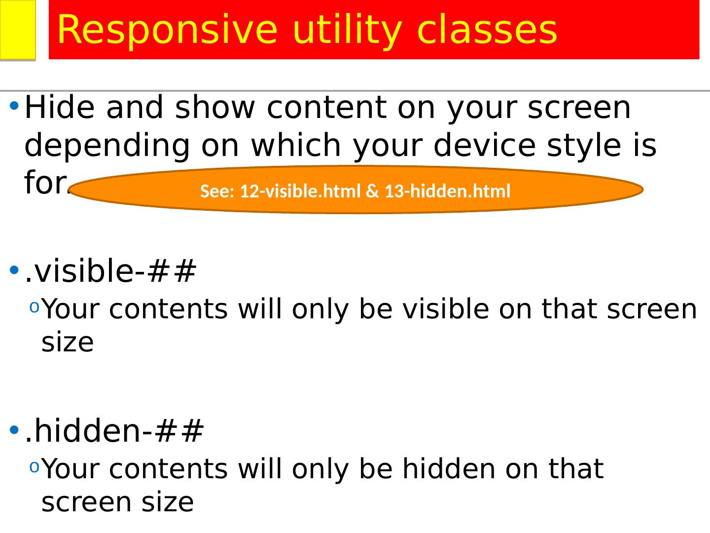 16 .Hide and show content on your screen depending on which your device style is for. .visible-## Your contents will only be visible on that screen size .hidden-## Your contents will only be hidden on that screen size Responsive utility classes See: 12-visible.html & 13-hidden.html
