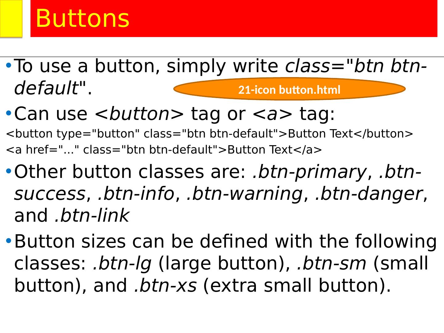 18 .To use a button, simply write class=" btn btn -default " . Can use <button> tag or <a> tag: < button type="button" class=" btn btn -default">Button Text</button > <a href ="..." class=" btn btn -default">Button Text</a > Other button classes are: . btn -primary , . btn -success , . btn -info , . btn -warning , . btn -danger , and . btn -link Button sizes can be defined with the following classes: . btn-lg (large button), . btn-sm (small button), and . btn-xs (extra small button). Buttons 21-icon button.html