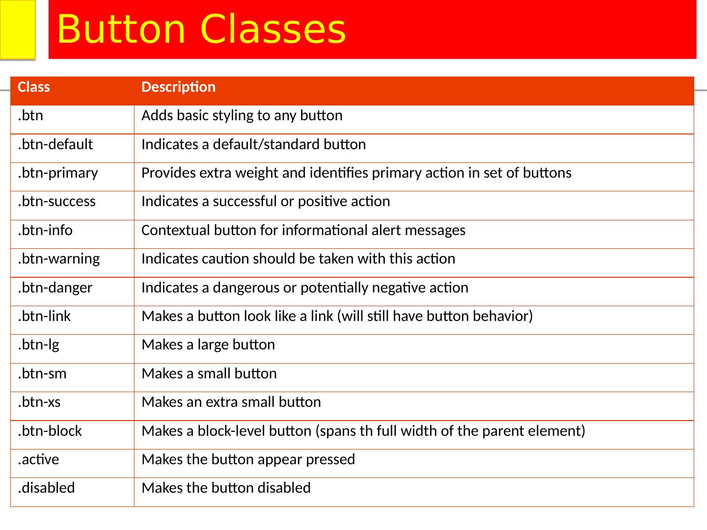 20 .Class Description . btn Adds basic styling to any button . btn -default Indicates a default/standard button . btn -primary Provides extra weight and identifies primary action in set of buttons . btn -success Indicates a successful or positive action . btn -info Contextual button for informational alert messages . btn -warning Indicates caution should be taken with this action . btn -danger Indicates a dangerous or potentially negative action . btn -link Makes a button look like a link (will still have button behavior) . btn-lg Makes a large button . btn-sm Makes a small button . btn-xs Makes an extra small button . btn -block Makes a block-level button (spans th full width of the parent element) .active Makes the button appear pressed .disabled Makes the button disabled Button Classes