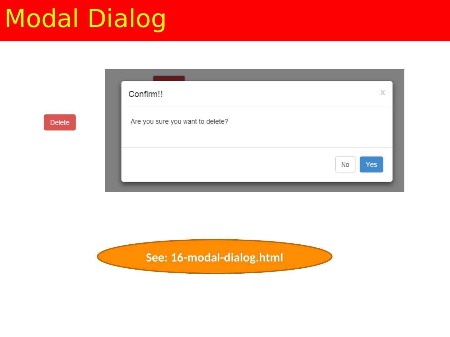19 .<div class="container"> <div class="row"> <div class="col-md-8 text-center"> < br /> <div class=" btn -group"> <input class=" btn " type="submit" value="Save" /> <button class=" btn btn -danger">Delete</button> <a href ="#" class=" btn btn -primary">Update</a> </div> </div> <div class="col-md-4"> </div> </div> </div> Styling buttons See: 15-buttons.html