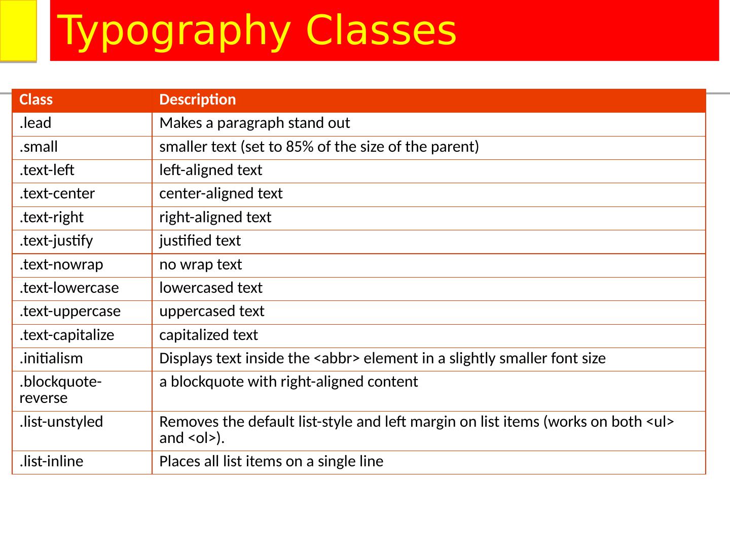 23 .Class Description .lead Makes a paragraph stand out .small smaller text (set to 85% of the size of the parent) .text-left left-aligned text .text-center center-aligned text .text-right right-aligned text .text-justify justified text .text- nowrap no wrap text .text-lowercase lowercased text .text-uppercase uppercased text .text-capitalize capitalized text . initialism Displays text inside the < abbr > element in a slightly smaller font size . blockquote -reverse a blockquote with right-aligned content .list- unstyled Removes the default list-style and left margin on list items (works on both < ul > and < ol >). .list-inline Places all list items on a single line Typography Classes