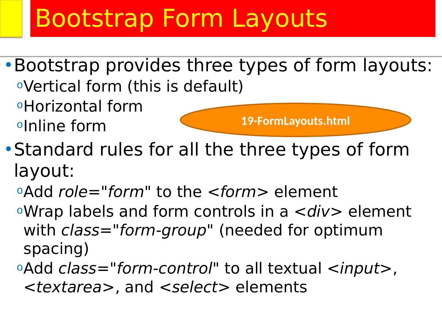 24 .Bootstrap provides three types of form layouts : Vertical form (this is default ) Horizontal form Inline form Standard rules for all the three types of form layout : Add role="form" to the <form> element Wrap labels and form controls in a <div> element with class="form-group" (needed for optimum spacing ) Add class="form-control" to all textual <input> , < textarea > , and <select> elements Bootstrap Form Layouts 19-FormLayouts.html