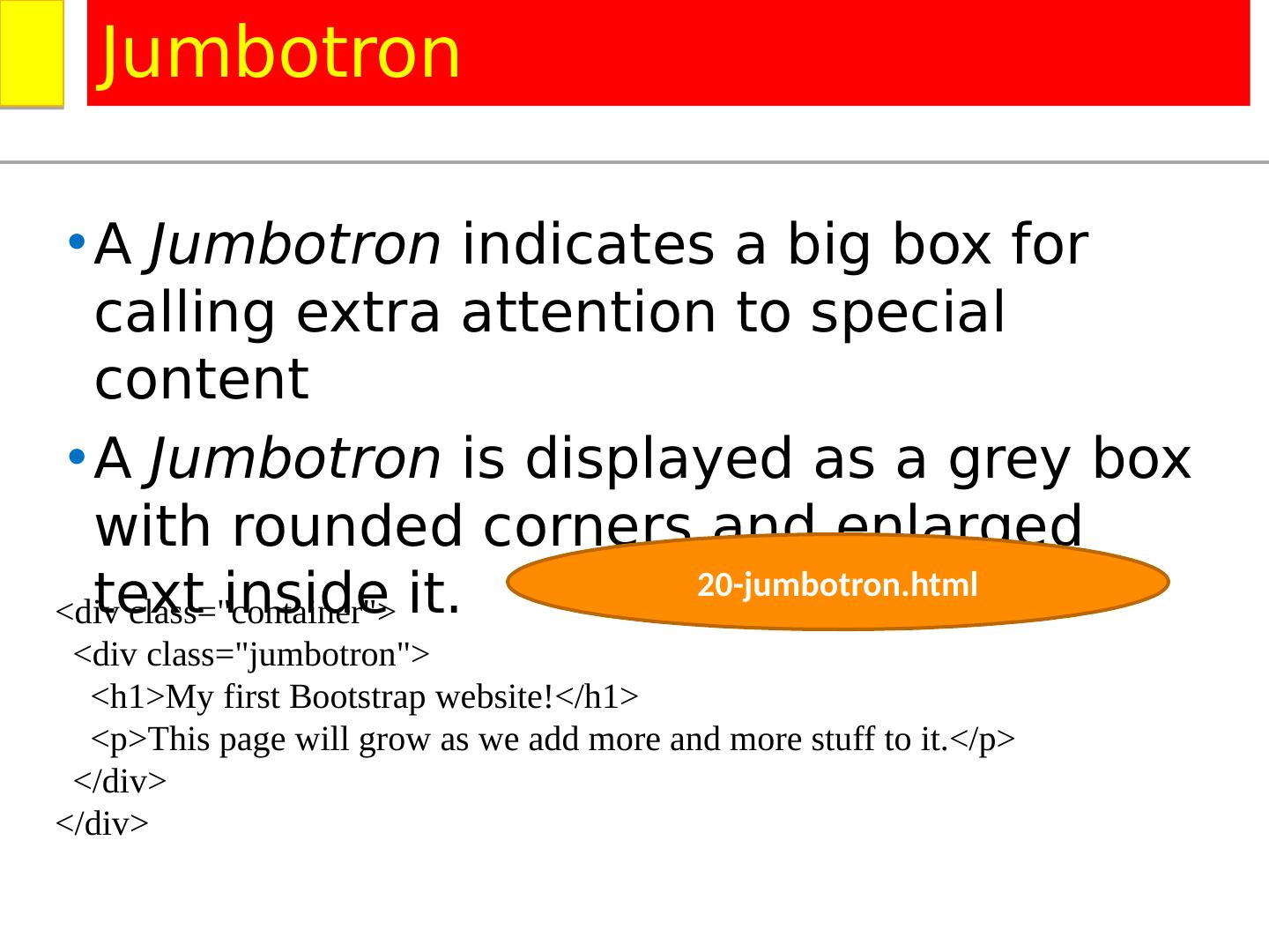 25 .A Jumbotron indicates a big box for calling extra attention to special content A Jumbotron is displayed as a grey box with rounded corners and enlarged text inside it. Jumbotron <div class="container"> <div class=" jumbotron "> <h1>My first Bootstrap website!</h1> <p>This page will grow as we add more and more stuff to it.</ p> </div> </div> 20-jumbotron.html