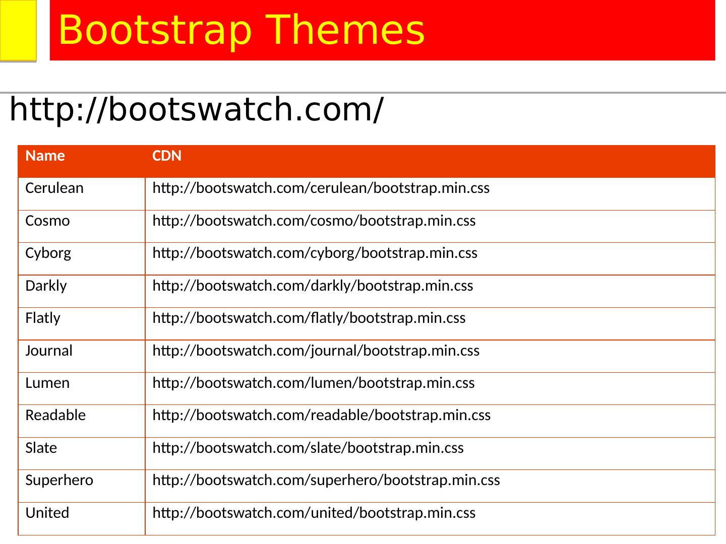 27 .http://bootswatch.com/ Bootstrap Themes Name CDN Cerulean http://bootswatch.com/cerulean/bootstrap.min.css Cosmo http://bootswatch.com/cosmo/bootstrap.min.css Cyborg http://bootswatch.com/cyborg/bootstrap.min.css Darkly http://bootswatch.com/darkly/bootstrap.min.css Flatly http://bootswatch.com/flatly/bootstrap.min.css Journal http://bootswatch.com/journal/bootstrap.min.css Lumen http://bootswatch.com/lumen/bootstrap.min.css Readable http://bootswatch.com/readable/bootstrap.min.css Slate http://bootswatch.com/slate/bootstrap.min.css Superhero http://bootswatch.com/superhero/bootstrap.min.css United http://bootswatch.com/united/bootstrap.min.css