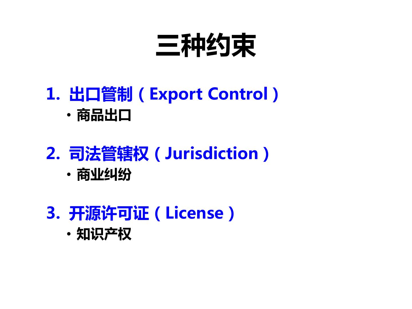 4 . 三种约束 1. 出口管制(Export Control) • 商品出口 2. 司法管辖权(Jurisdiction) • 商业纠纷 3. 开源许可证(License) • 知识产权