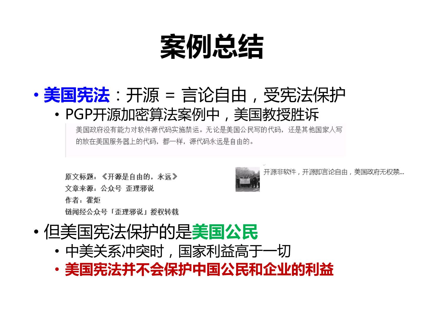 10 . 案例总结 • 美国宪法:开源 = 言论自由,受宪法保护 • PGP开源加密算法案例中,美国教授胜诉 • 但美国宪法保护的是美国公民 • 中美关系冲突时,国家利益高于一切 • 美国宪法并不会保护中国公民和企业的利益