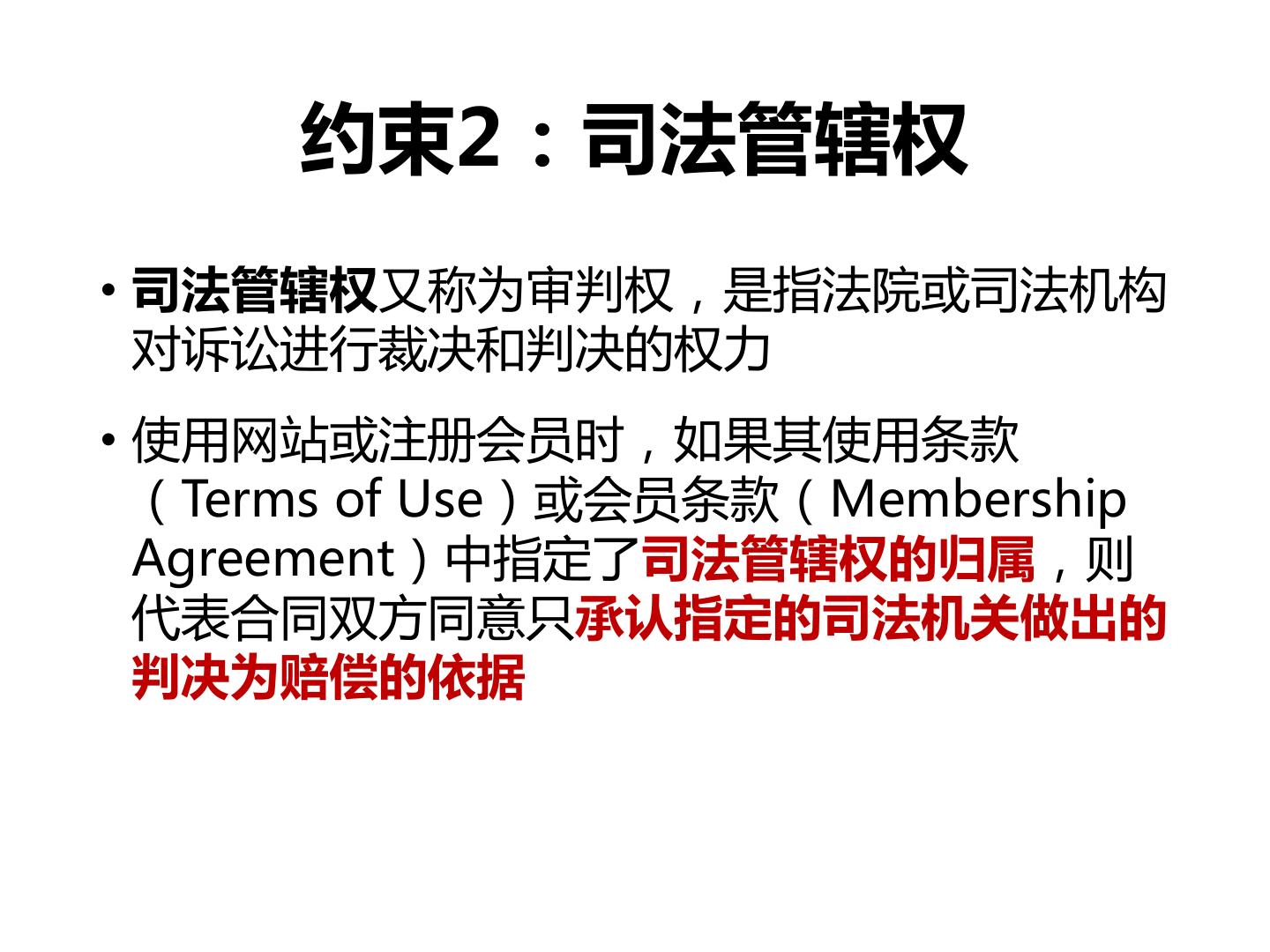 11 . 约束2:司法管辖权 • 司法管辖权又称为审判权,是指法院或司法机构 对诉讼进行裁决和判决的权力 • 使用网站或注册会员时,如果其使用条款 (Terms of Use)或会员条款(Membership Agreement)中指定了司法管辖权的归属,则 代表合同双方同意只承认指定的司法机关做出的 判决为赔偿的依据