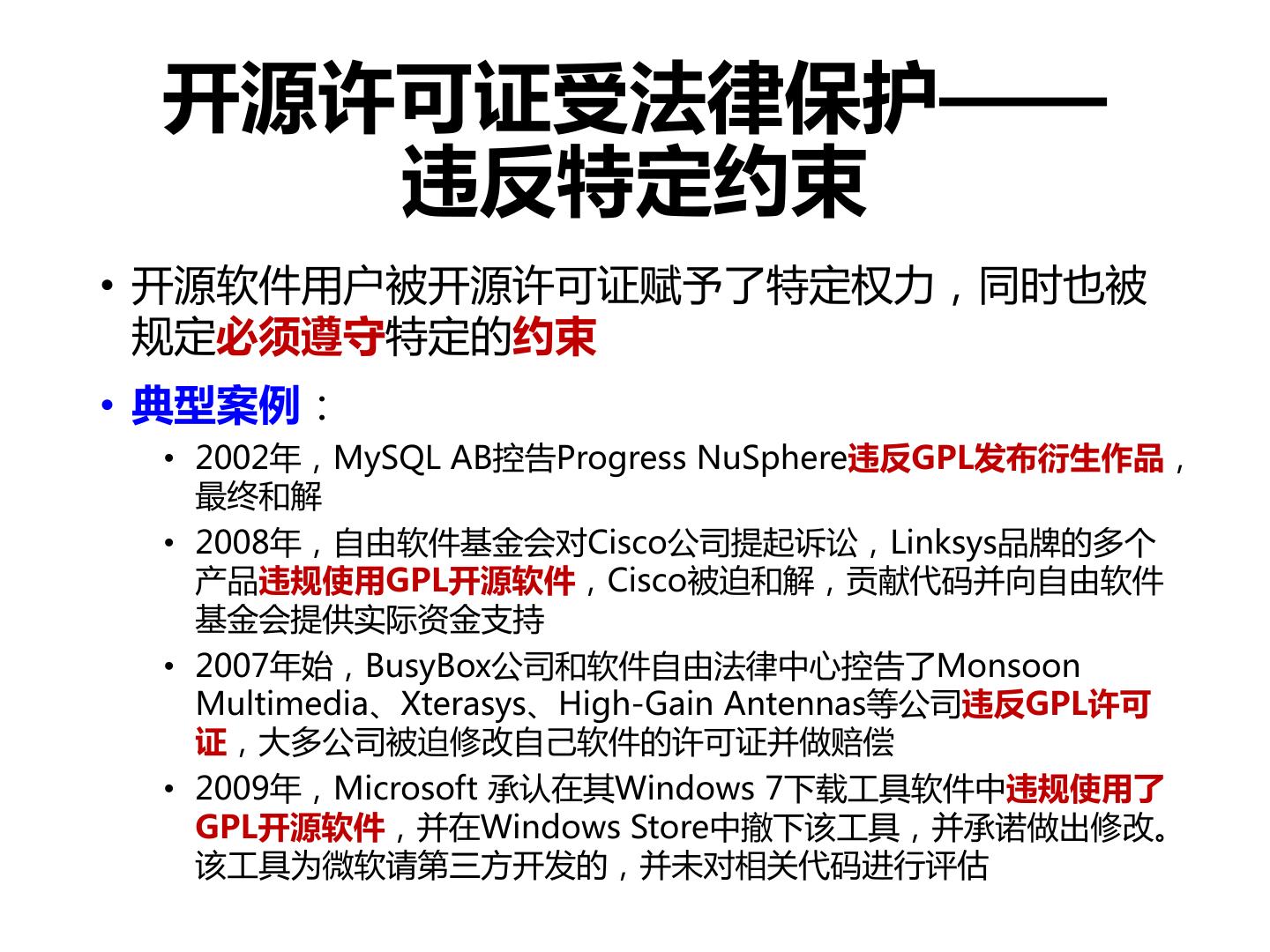 16 . 开源许可证受法律保护—— 违反特定约束 • 开源软件用户被开源许可证赋予了特定权力,同时也被 规定必须遵守特定的约束 • 典型案例: • 2002年,MySQL AB控告Progress NuSphere违反GPL发布衍生作品, 最终和解 • 2008年,自由软件基金会对Cisco公司提起诉讼,Linksys品牌的多个 产品违规使用GPL开源软件,Cisco被迫和解,贡献代码并向自由软件 基金会提供实际资金支持 • 2007年始,BusyBox公司和软件自由法律中心控告了Monsoon Multimedia、Xterasys、High-Gain Antennas等公司违反GPL许可 证,大多公司被迫修改自己软件的许可证并做赔偿 • 2009年,Microsoft 承认在其Windows 7下载工具软件中违规使用了 GPL开源软件,并在Windows Store中撤下该工具,并承诺做出修改。 该工具为微软请第三方开发的,并未对相关代码进行评估