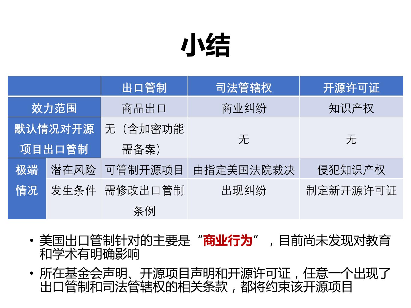 6 . 默认情况 vs. 潜在风险 • 默认情况:开源项目(除含加密功能的开源项目需 备案外),都属于“公开可获得”的代码,可以正 常使用 • 极端情况下的潜在风险:如果一个开源项目或开源 组织声明遵从美国的出口管制条例,一旦美国修改 EAR,将高性能软件、EDA软件等一些核心基础软 件加入到管制中并且将目前“备案即不被管制”修 改为“备案且需要被管制”,那就意味着大量核心 开源项目将受到出口管制 • 2018年11月,美国BIS曾就AI和机器学习等新兴技术是否 加入管制名单征求公众意见(后未果)