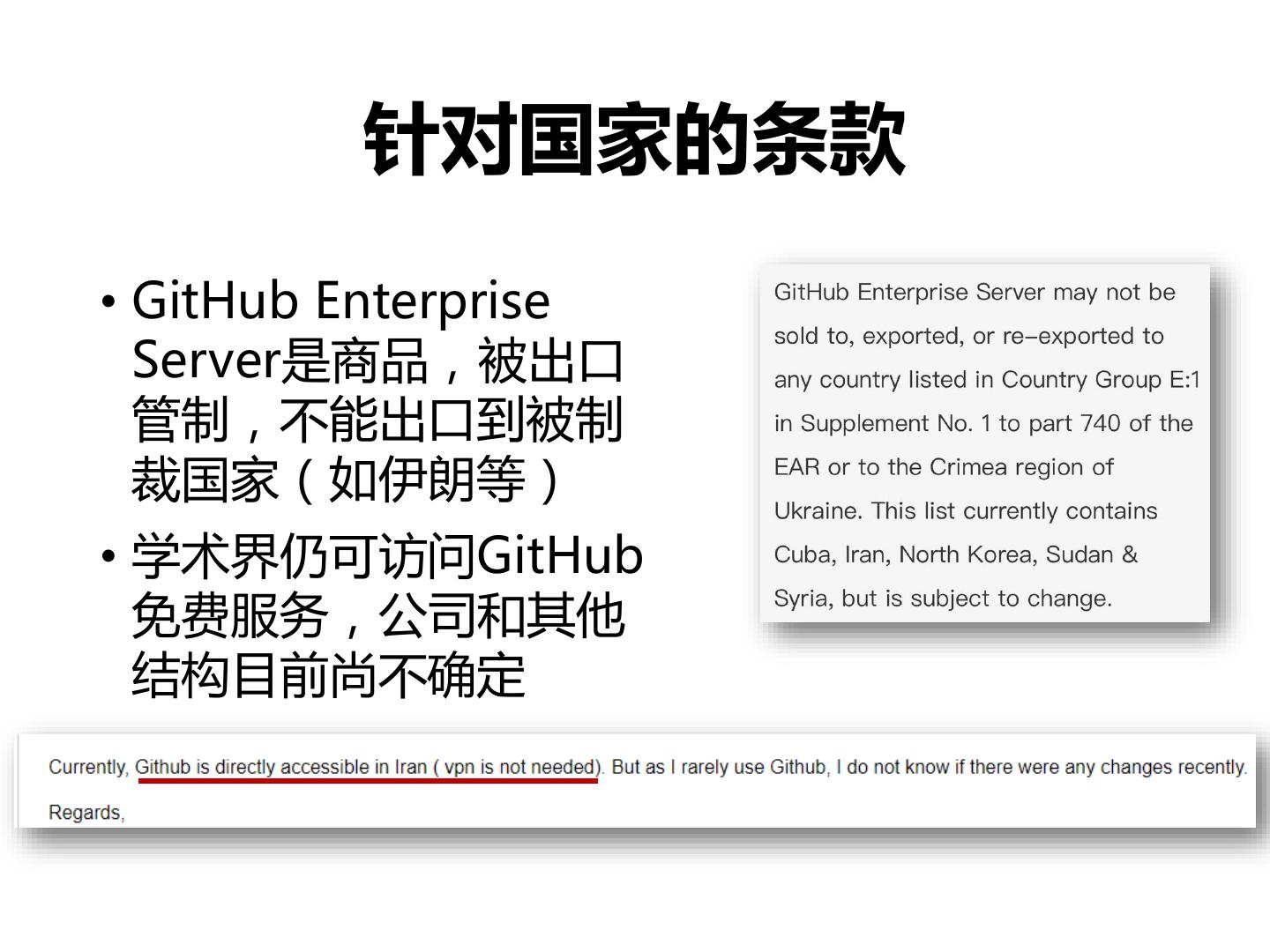 26 . 针对国家的条款 • GitHub Enterprise Server是商品,被出口 管制,不能出口到被制 裁国家(如伊朗等) • 学术界仍可访问GitHub 免费服务,公司和其他 结构目前尚不确定