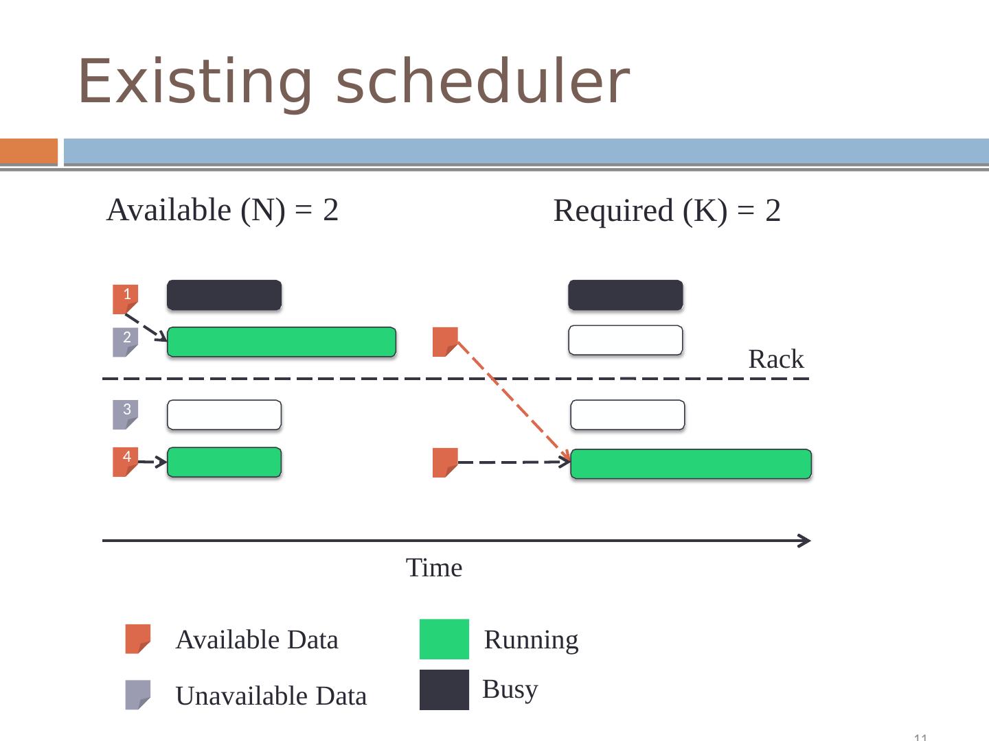 8 .Existing scheduler Available (N) = 2 Required (K) = 2 1 2 Rack 3 4 Time Available Data Running Busy Unavailable Data 11