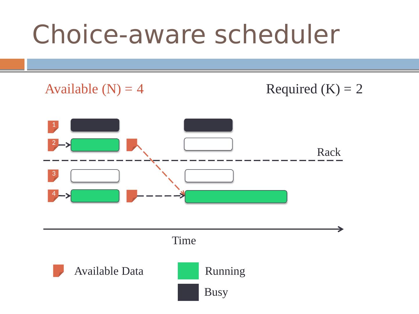 9 .Choice-aware scheduler Available (N) = 4 Required (K) = 2 1 2 Rack 3 4 Time Available Data Running Busy