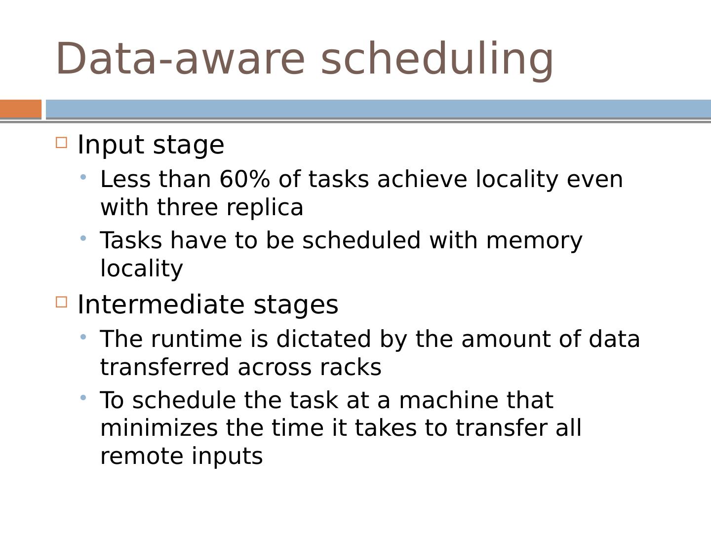 10 .Data-aware scheduling Input stage Less than 60% of tasks achieve locality even with three replica Tasks have to be scheduled with memory locality Intermediate stages The runtime is dictated by the amount of data transferred across racks To schedule the task at a machine that minimizes the time it takes to transfer all remote inputs