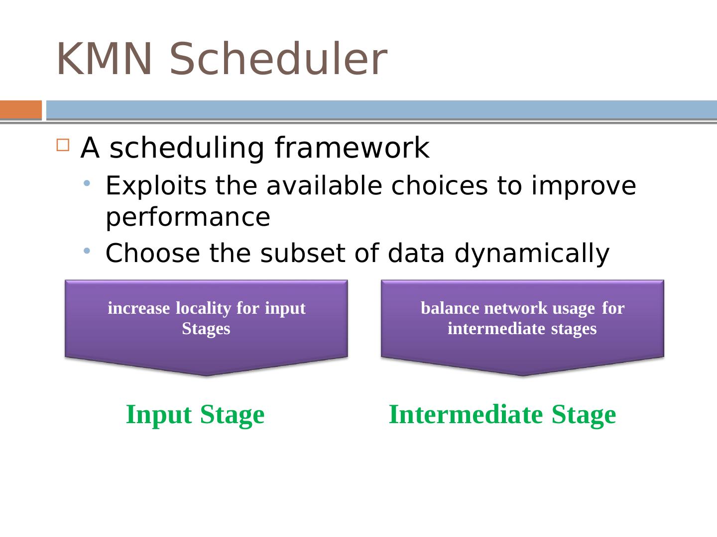 12 .KMN Scheduler A scheduling framework Exploits the available choices to improve performance Choose the subset of data dynamically i ncr ease lo c al i ty f o r i nput S tag e s b alan c e n e t w o rk usage fo r i n t er m ed i a t e stag e s Input S tage In t e r medi a t e S tage