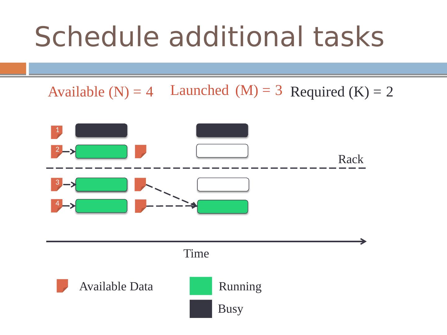 16 .Schedule additional tasks Launched (M) = 3 Available (N) = 4 Required (K) = 2 1 2 Rack 3 4 Time Available Data Running Busy