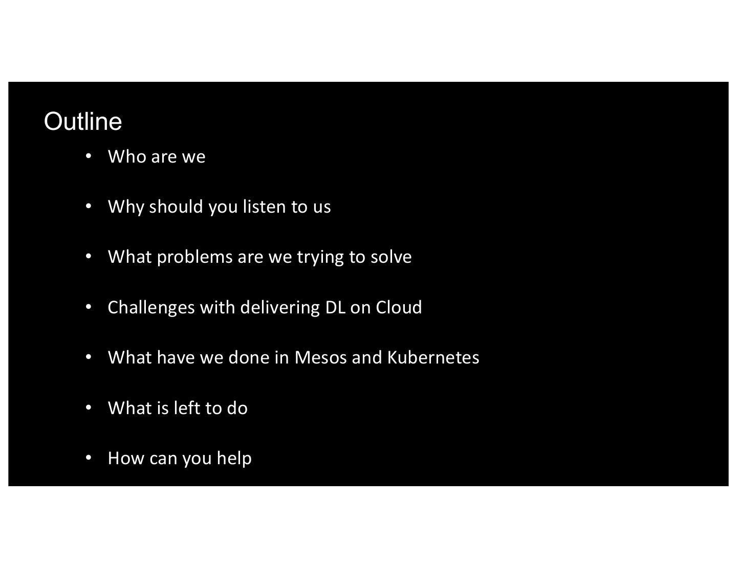 2 . Outline • Who are we • Why should you listen to us • What problems are we trying to solve • Challenges with delivering DL on Cloud • What have we done in Mesos and Kubernetes • What is left to do 2 • How can you help IBM 5/8/17