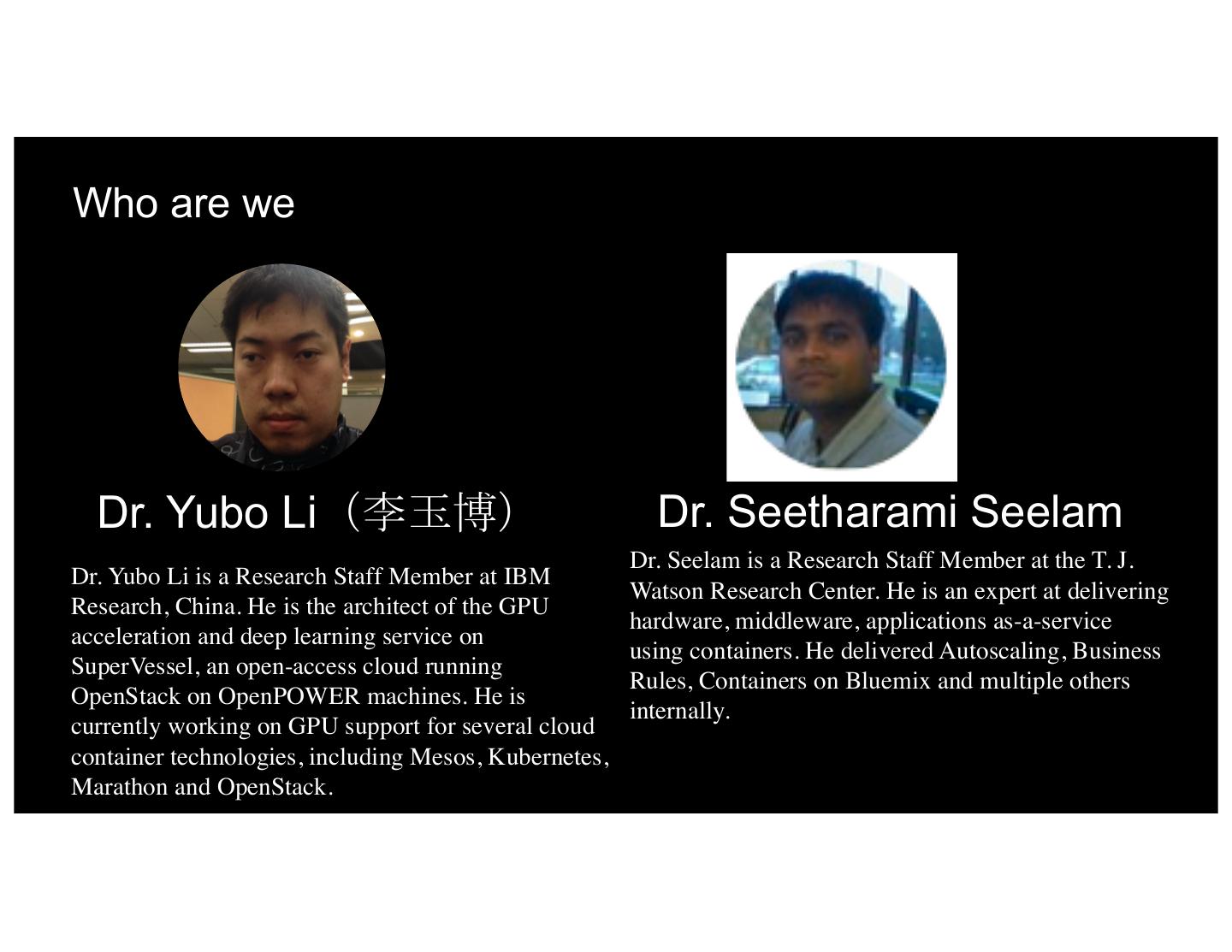 1 .Speeding up Deep Learning Services: When GPUs meet Container Clouds Dr. Seetharami Seelam & Dr. Yubo Li Research Staff Members IBM Research 1 GPU Tech Conference: San Jose, CA – May 10, 2017