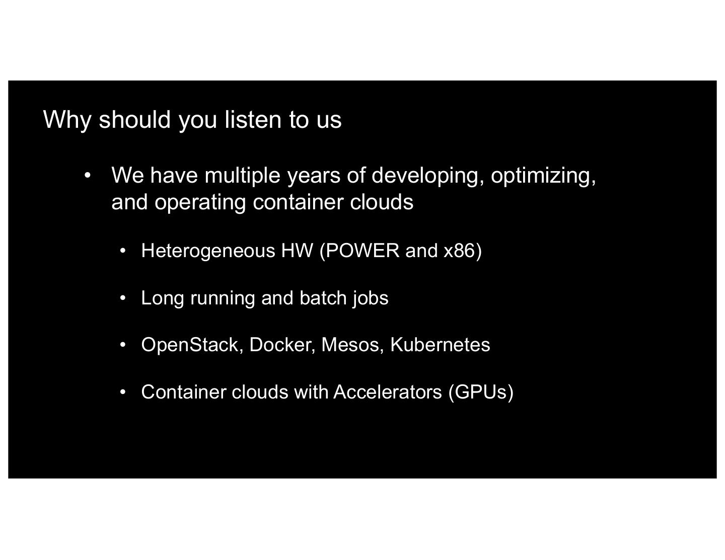 4 . Why should you listen to us • We have multiple years of developing, optimizing, and operating container clouds • Heterogeneous HW (POWER and x86) • Long running and batch jobs • OpenStack, Docker, Mesos, Kubernetes • Container clouds with Accelerators (GPUs) 4 IBM 5/8/17