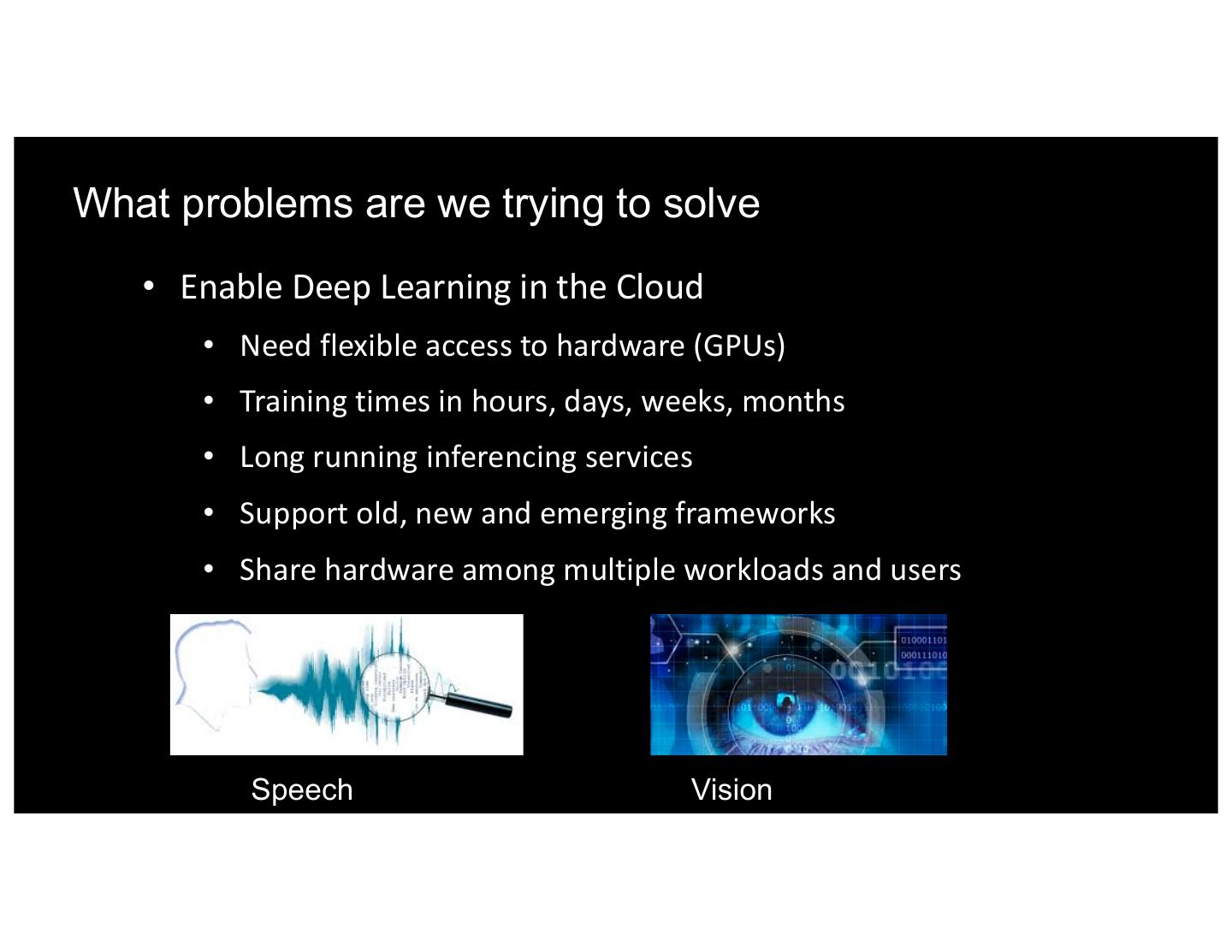 5 . What problems are we trying to solve • Enable Deep Learning in the Cloud • Need flexible access to hardware (GPUs) • Training times in hours, days, weeks, months • Long running inferencing services • Support old, new and emerging frameworks • Share hardware among multiple workloads and users 5 IBM Speech 5/8/17 Vision