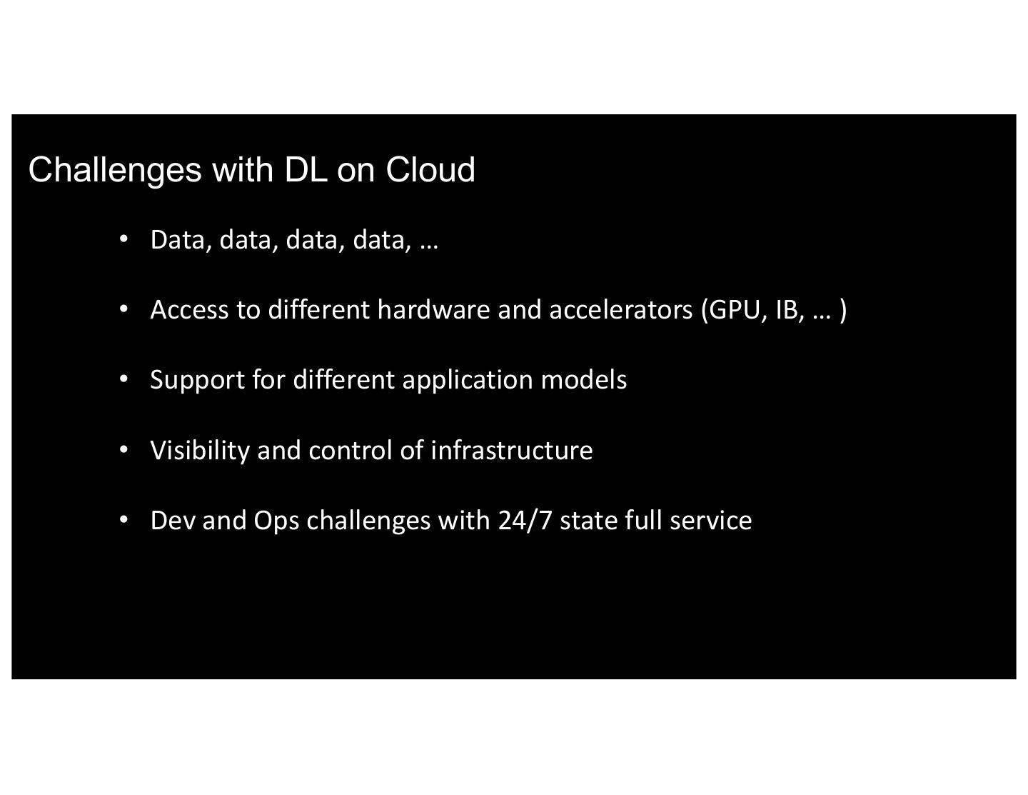 7 .Challenges with DL on Cloud • Data, data, data, data, … • Access to different hardware and accelerators (GPU, IB, … ) • Support for different application models • Visibility and control of infrastructure • Dev and Ops challenges with 24/7 state full service 7 IBM 5/8/17