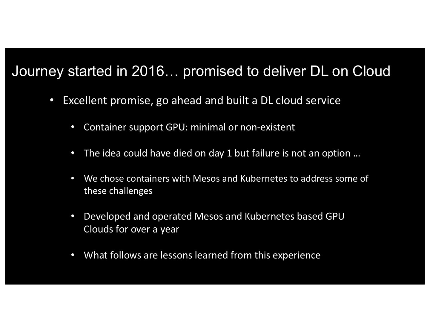 8 .Journey started in 2016… promised to deliver DL on Cloud • Excellent promise, go ahead and built a DL cloud service • Container support GPU: minimal or non-existent • The idea could have died on day 1 but failure is not an option … • We chose containers with Mesos and Kubernetes to address some of these challenges • Developed and operated Mesos and Kubernetes based GPU Clouds for over a year • What follows are lessons learned from this experience 8 IBM 5/8/17