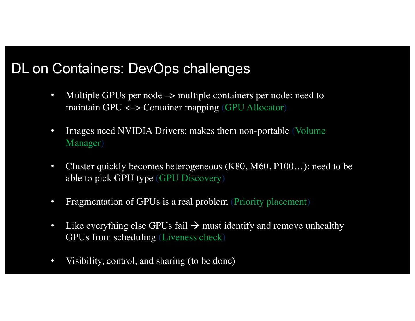 9 .DL on Containers: DevOps challenges • Multiple GPUs per node –> multiple containers per node: need to maintain GPU <–> Container mapping (GPU Allocator) • Images need NVIDIA Drivers: makes them non-portable (Volume Manager) • Cluster quickly becomes heterogeneous (K80, M60, P100…): need to be able to pick GPU type (GPU Discovery) • Fragmentation of GPUs is a real problem (Priority placement) • Like everything else GPUs fail à must identify and remove unhealthy GPUs from scheduling (Liveness check) 9 • IBM control, Visibility, 5/8/17 and sharing (to be done)