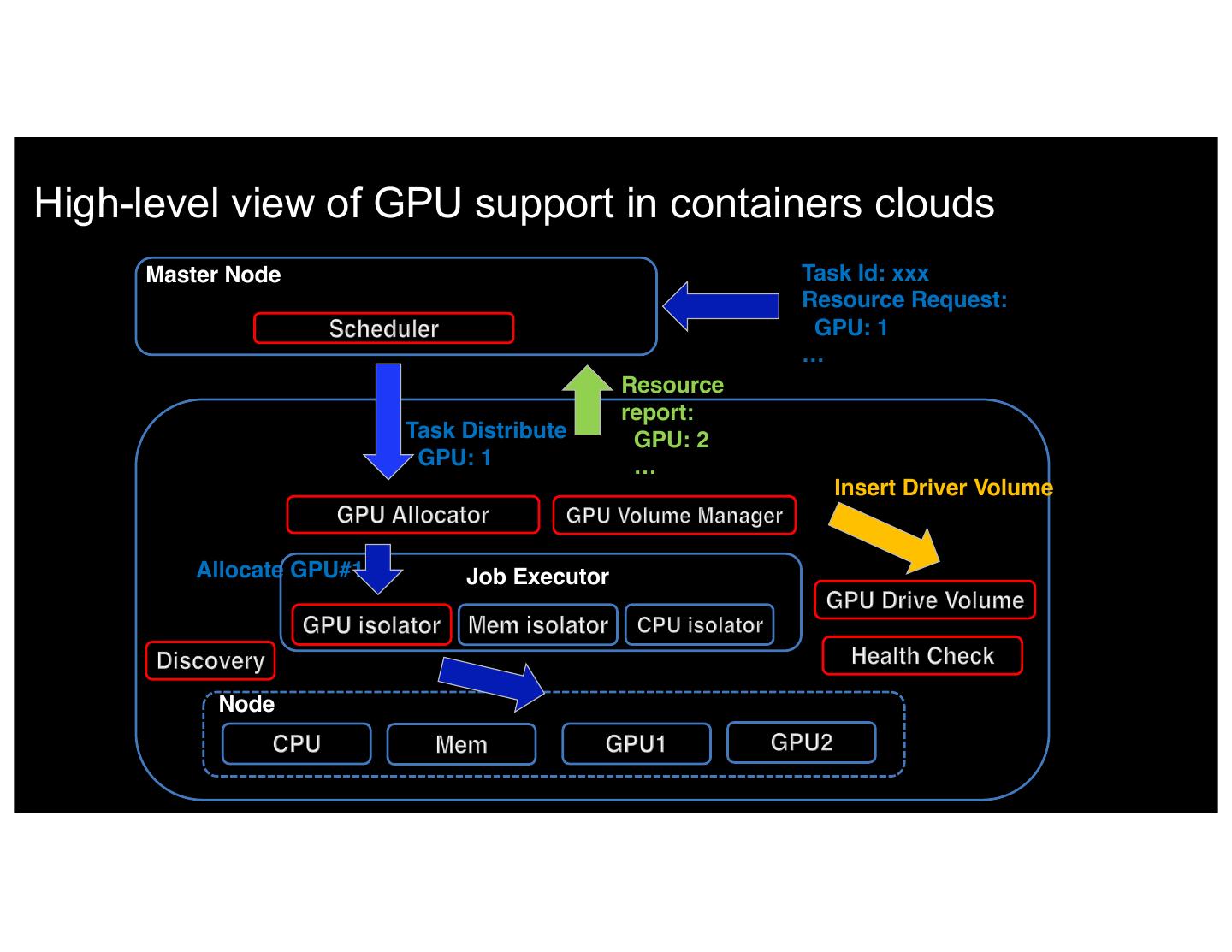 10 .High-level view of GPU support in containers clouds Master Node Task Id: xxx Resource Request: GPU: 1 … Resource report: Worker Node Task Distribute GPU: 2 GPU: 1 … Insert Driver Volume Allocate GPU#1 Job Executor Node IBM 5/8/17 11