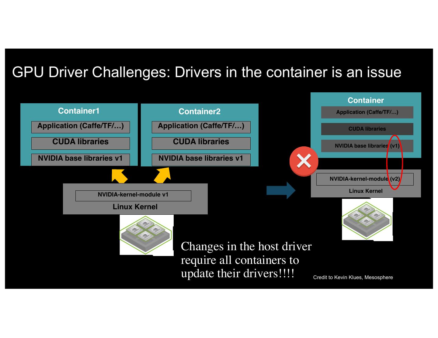 13 .GPU Driver Challenges: NVIDIA-Docker solves it Container Container Application (Caffe/TF/…) Application (Caffe/TF/…) CUDA libraries CUDA libraries NVIDIA base libraries (v2) NVIDIA base libraries (v1) Volume Injection NVIDIA base libraries (v2) NVIDIA-kernel-module (v2) NVIDIA-kernel-module (v2) Linux Kernel Linux Kernel App will not work if NVIDIA libraries and kernel module versions are not match