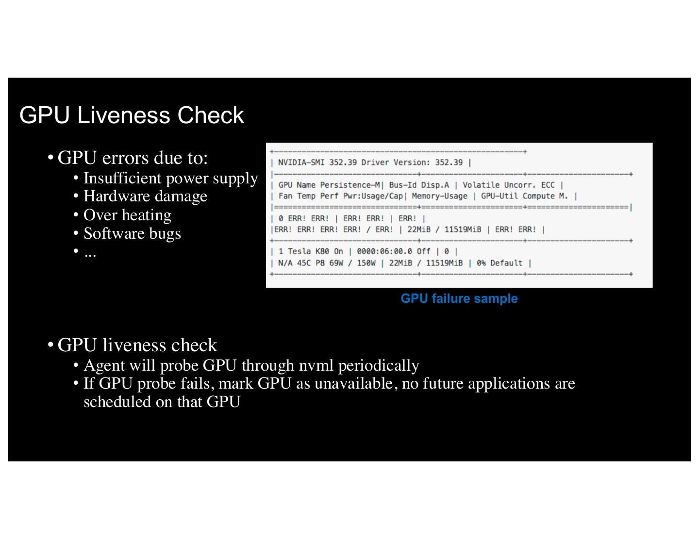 20 .GPU Liveness Check • GPU errors due to: • Insufficient power supply • Hardware damage • Over heating • Software bugs • ... GPU failure sample • GPU liveness check • Agent will probe GPU through nvml periodically • If GPU probe fails, mark GPU as unavailable, no future applications are scheduled on that GPU 20 IBM 5/8/17