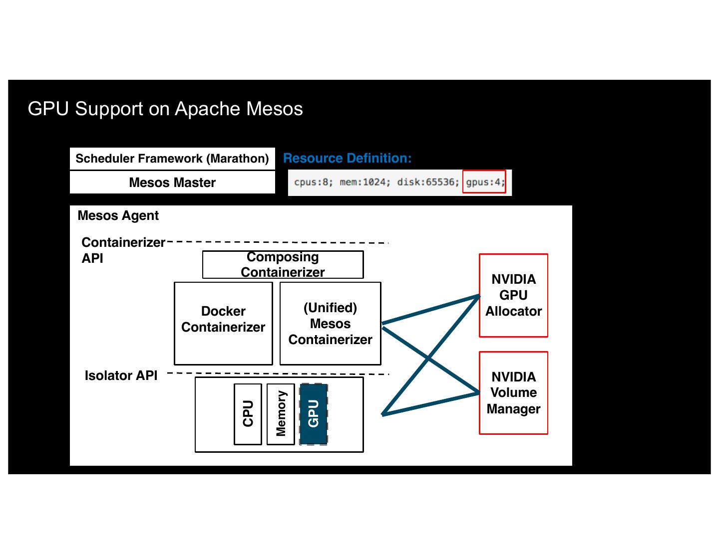 22 .GPU Support on Apache Mesos Scheduler Framework (Marathon) Resource Definition: Mesos Master Mesos Agent Containerizer API Composing Containerizer NVIDIA GPU Docker (Unified) Allocator Containerizer Mesos Containerizer Isolator API NVIDIA Volume Memory GPU CPU Manager 22