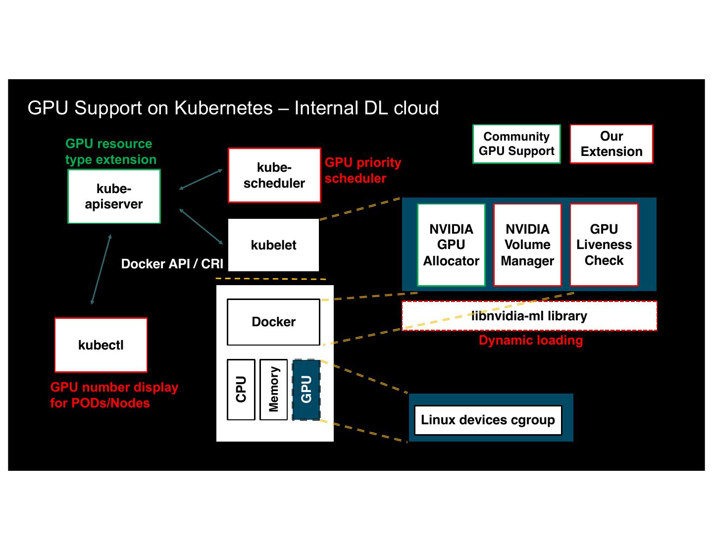 25 .GPU Support on Kubernetes – Internal DL cloud Community Our GPU resource GPU Support Extension type extension GPU priority kube- scheduler scheduler NVIDIA GPU Manager kube- apiserver NVIDIA NVIDIA GPU kubelet GPU Volume Liveness Docker API / CRI Allocator Manager Check Docker libnvidia-ml library kubectl Dynamic loading Memory GPU CPU GPU number display for PODs/Nodes Linux devices cgroup 24