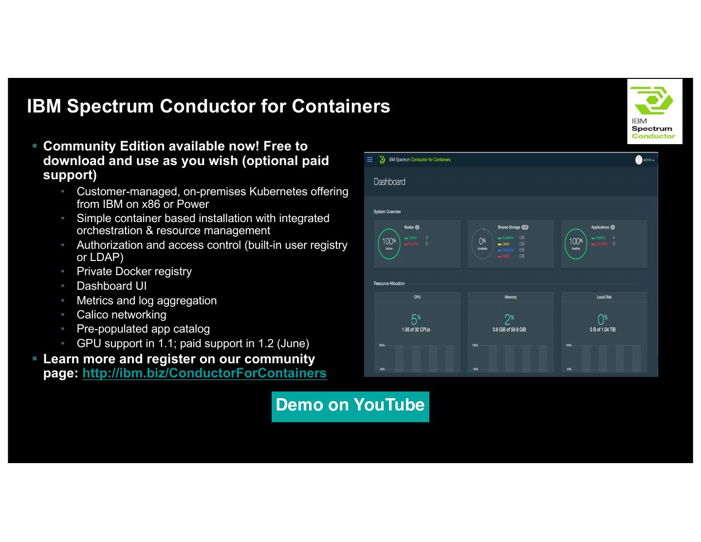 29 .IBM Spectrum Conductor for Containers § Community Edition available now! Free to download and use as you wish (optional paid support) • Customer-managed, on-premises Kubernetes offering from IBM on x86 or Power • Simple container based installation with integrated orchestration & resource management • Authorization and access control (built-in user registry or LDAP) • Private Docker registry • Dashboard UI • Metrics and log aggregation • Calico networking • Pre-populated app catalog • GPU support in 1.1; paid support in 1.2 (June) § Learn more and register on our community page: http://ibm.biz/ConductorForContainers Demo on YouTube 29