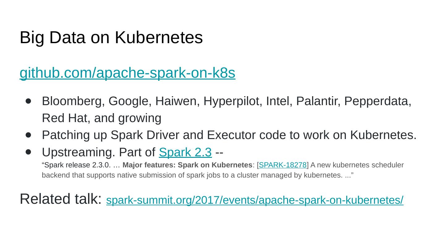8 .Big Data on Kubernetes github.com/apache-spark-on-k8s Bloomberg, Google, Haiwen, Hyperpilot, Intel, Palantir, Pepperdata, Red Hat, and growing Patching up Spark Driver and Executor code to work on Kubernetes. Upstreaming. Part of Spark 2.3 -- “Spark release 2.3.0. … Major features: Spark on Kubernetes : [ SPARK-18278 ] A new kubernetes scheduler backend that supports native submission of spark jobs to a cluster managed by kubernetes. ...” Related talk: spark-summit.org/2017/events/apache-spark-on-kubernetes/