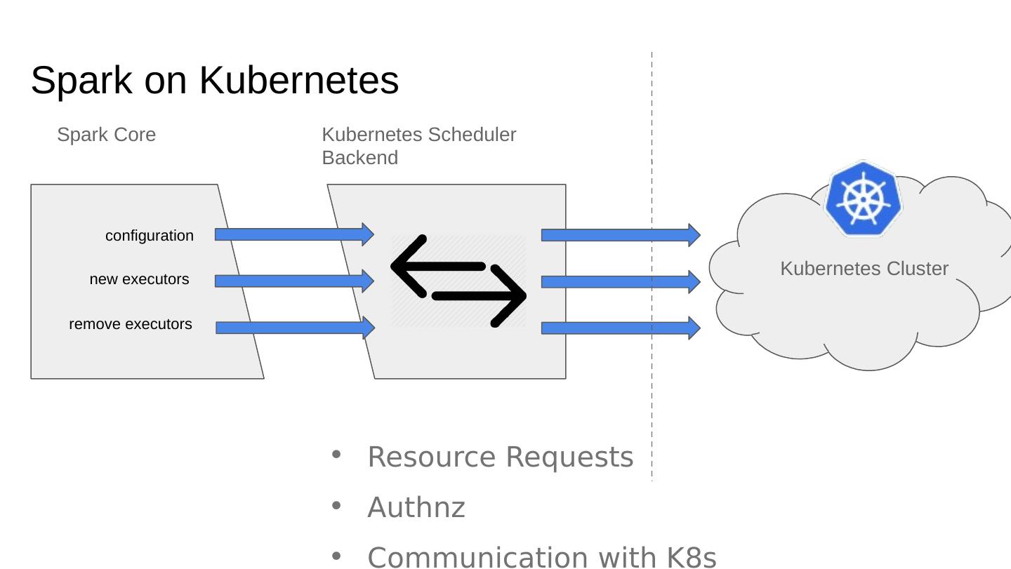 9 .Spark on Kubernetes Spark Core Kubernetes Scheduler Backend Kubernetes Cluster new executors remove executors configuration Resource Requests Authnz Communication with K8s