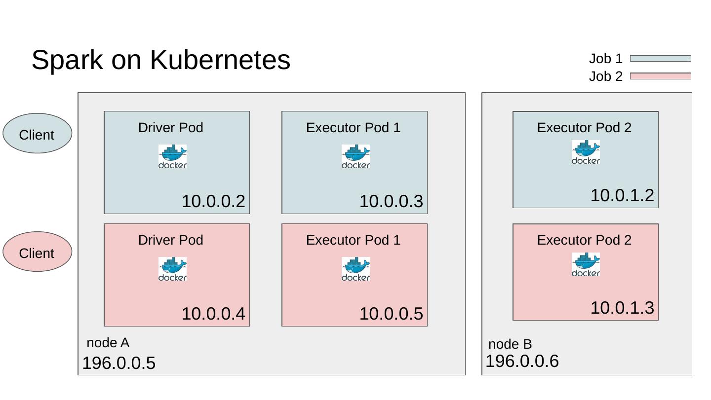 10 .Spark on Kubernetes node A node B Driver Pod Executor Pod 1 Executor Pod 2 10.0.0.2 196.0.0.5 196.0.0.6 10.0.0.3 10.0.1.2 Client Client Driver Pod Executor Pod 1 Executor Pod 2 10.0.0.4 10.0.0.5 10.0.1.3 Job 1 Job 2