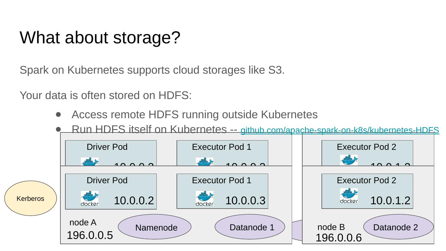 12 .What about storage? Spark on Kubernetes supports cloud storages like S3. Your data is often stored on HDFS: node A node B Driver Pod Executor Pod 1 Executor Pod 2 10.0.0.2 196.0.0.5 196.0.0.6 10.0.0.3 10.0.1.2 Namenode Datanode 1 Datanode 2 Access remote HDFS running outside Kubernetes Run HDFS itself on Kubernetes -- github.com/apache-spark-on-k8s/kubernetes-HDFS node A node B Driver Pod Executor Pod 1 Executor Pod 2 10.0.0.2 196.0.0.5 196.0.0.6 10.0.0.3 10.0.1.2 Namenode Datanode 1 Datanode 2 Kerberos