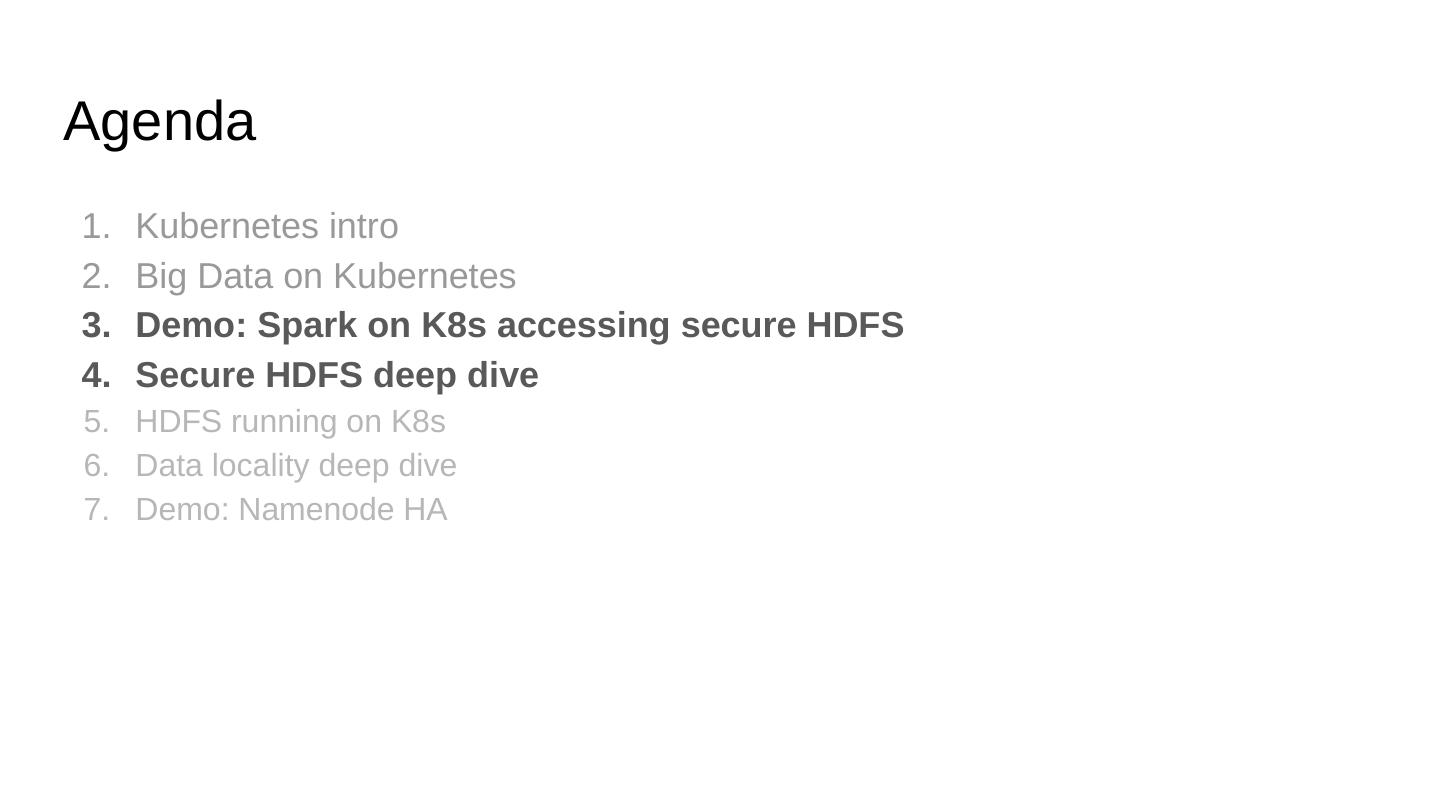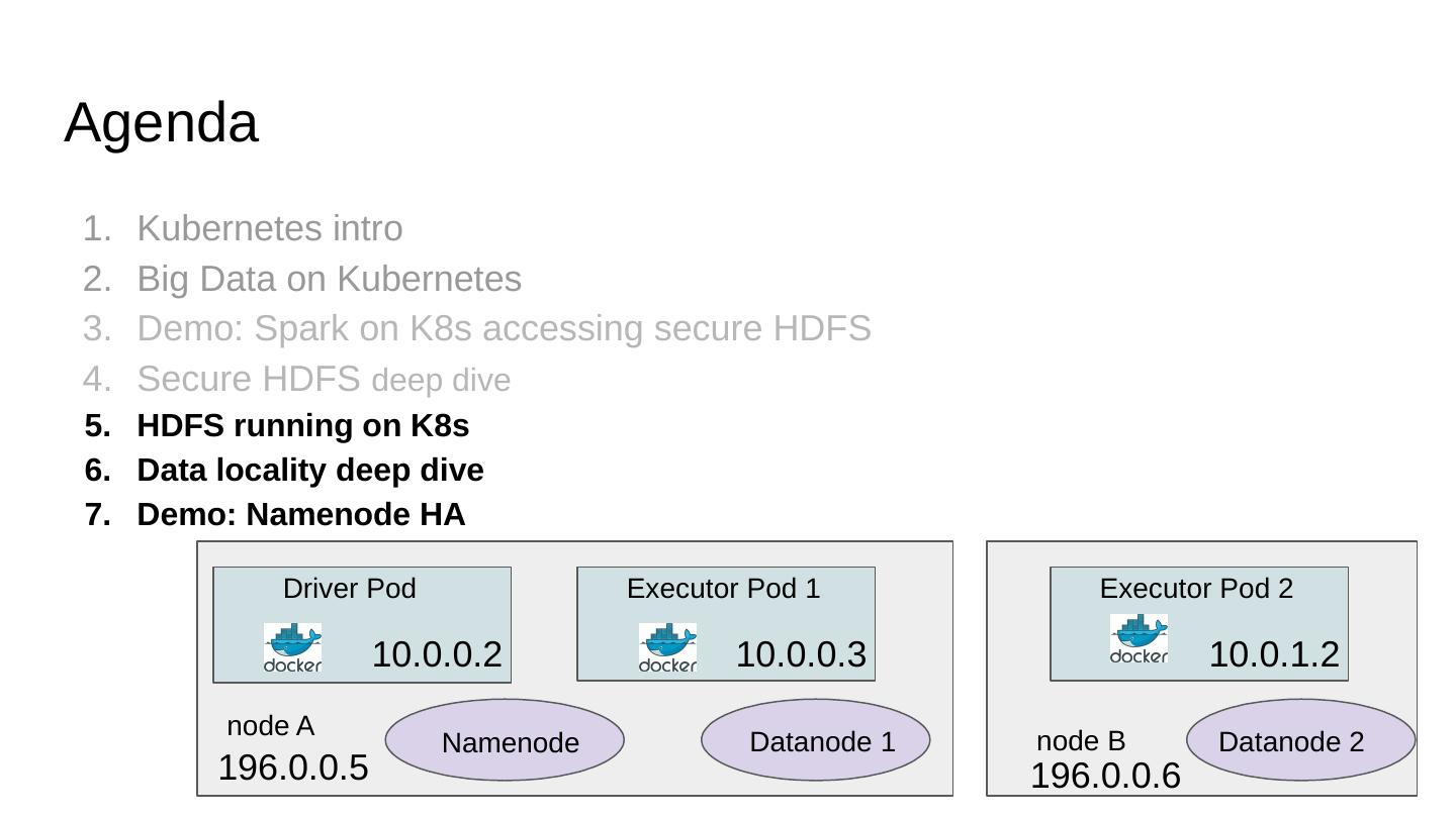 2 .Agenda Kubernetes intro Big Data on Kubernetes Demo: Spark on K8s accessing secure HDFS Secure HDFS deep dive HDFS running on K8s Data locality deep dive Demo: Namenode HA