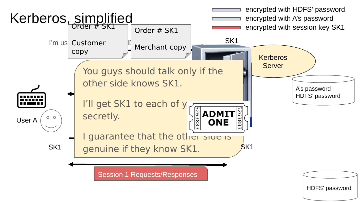 15 .HDFS namenode User A encrypted with session key SK1 encrypted with HDFS’ password encrypted with A’s password Session 1 Requests/Responses Kerberos Server A’s password HDFS’ password HDFS’ password I’m user A. May I talk to HDFS? SK1 copy for HDFS SK1 copy for User A SK1 copy for HDFS Ticket to HDFS Kerberos, simplified SK1 You guys should talk only if the other side knows SK1. I’ll get SK1 to each of you secretly. I guarantee that the other side is genuine if they know SK1. Order # SK1 Customer copy Order # SK1 Merchant copy SK1 SK1