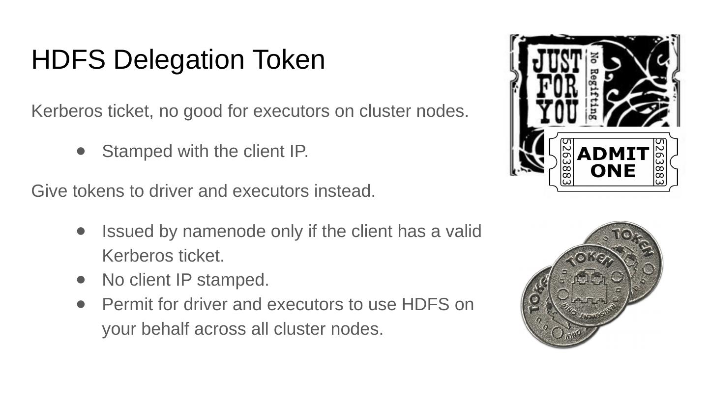 16 .HDFS Delegation Token Kerberos ticket, no good for executors on cluster nodes. Stamped with the client IP. Give tokens to driver and executors instead. Issued by namenode only if the client has a valid Kerberos ticket. No client IP stamped. Permit for driver and executors to use HDFS on your behalf across all cluster nodes.