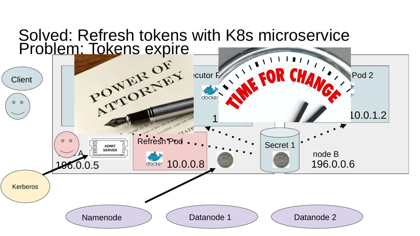 18 .Solved: Refresh tokens with K8s microservice node A node B Driver Pod Executor Pod 1 Executor Pod 2 10.0.0.2 196.0.0.5 196.0.0.6 10.0.0.3 10.0.1.2 Client Namenode Datanode 1 Datanode 2 Refresh Pod 10.0.0.8 Secret 1 Kerberos Problem: Tokens expire ADMIT SERVER
