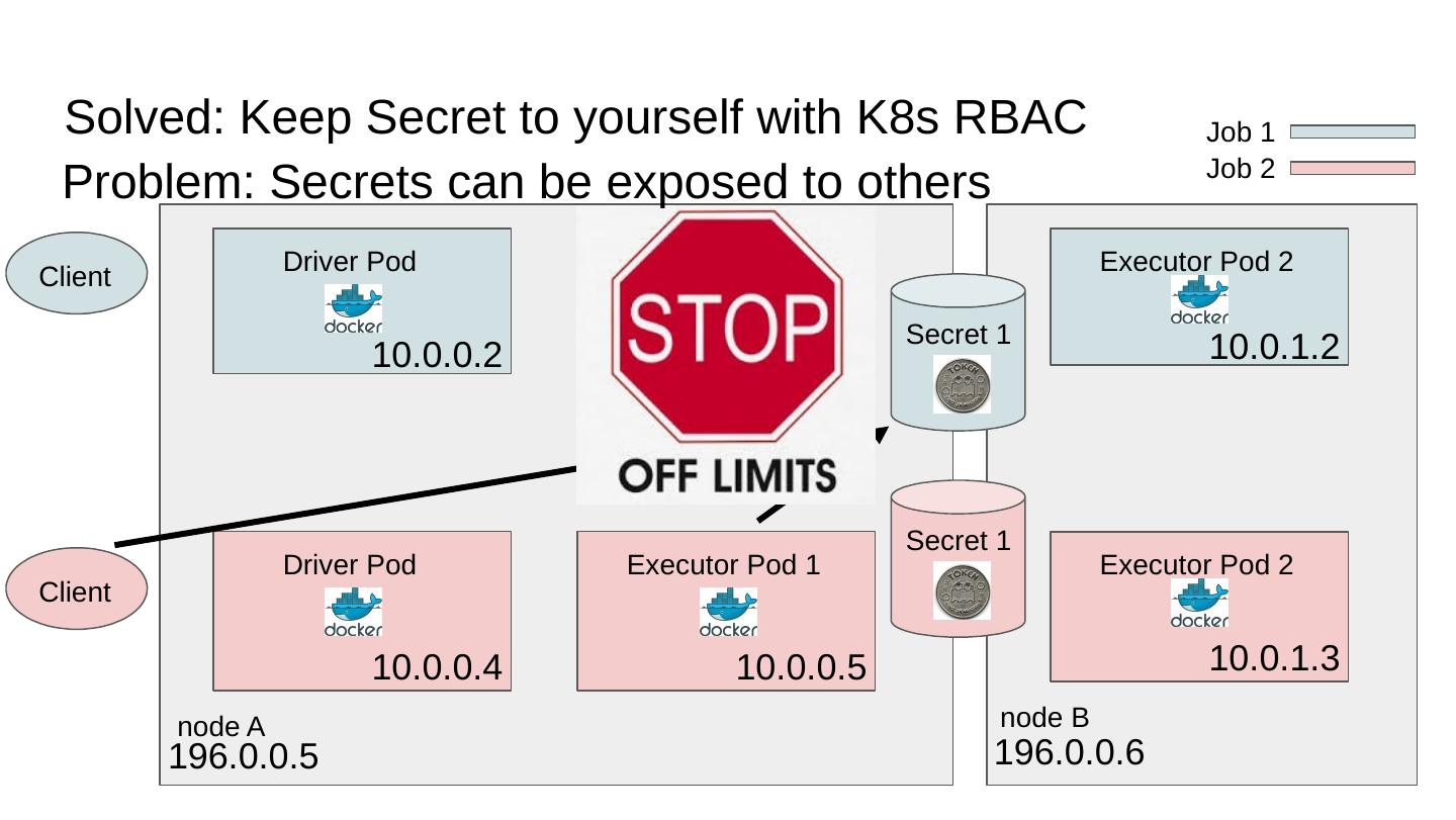 19 .Solved: Keep Secret to yourself with K8s RBAC node A node B Driver Pod Executor Pod 1 Executor Pod 2 10.0.0.2 196.0.0.5 196.0.0.6 10.0.0.3 10.0.1.2 Client Client Driver Pod Executor Pod 1 Executor Pod 2 10.0.0.4 10.0.0.5 10.0.1.3 Secret 1 Secret 1 Job 1 Job 2 Problem: Secrets can be exposed to others