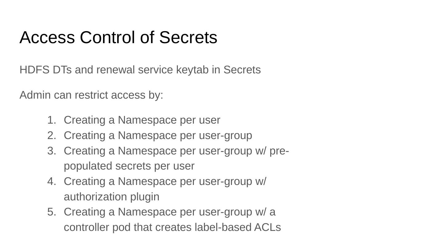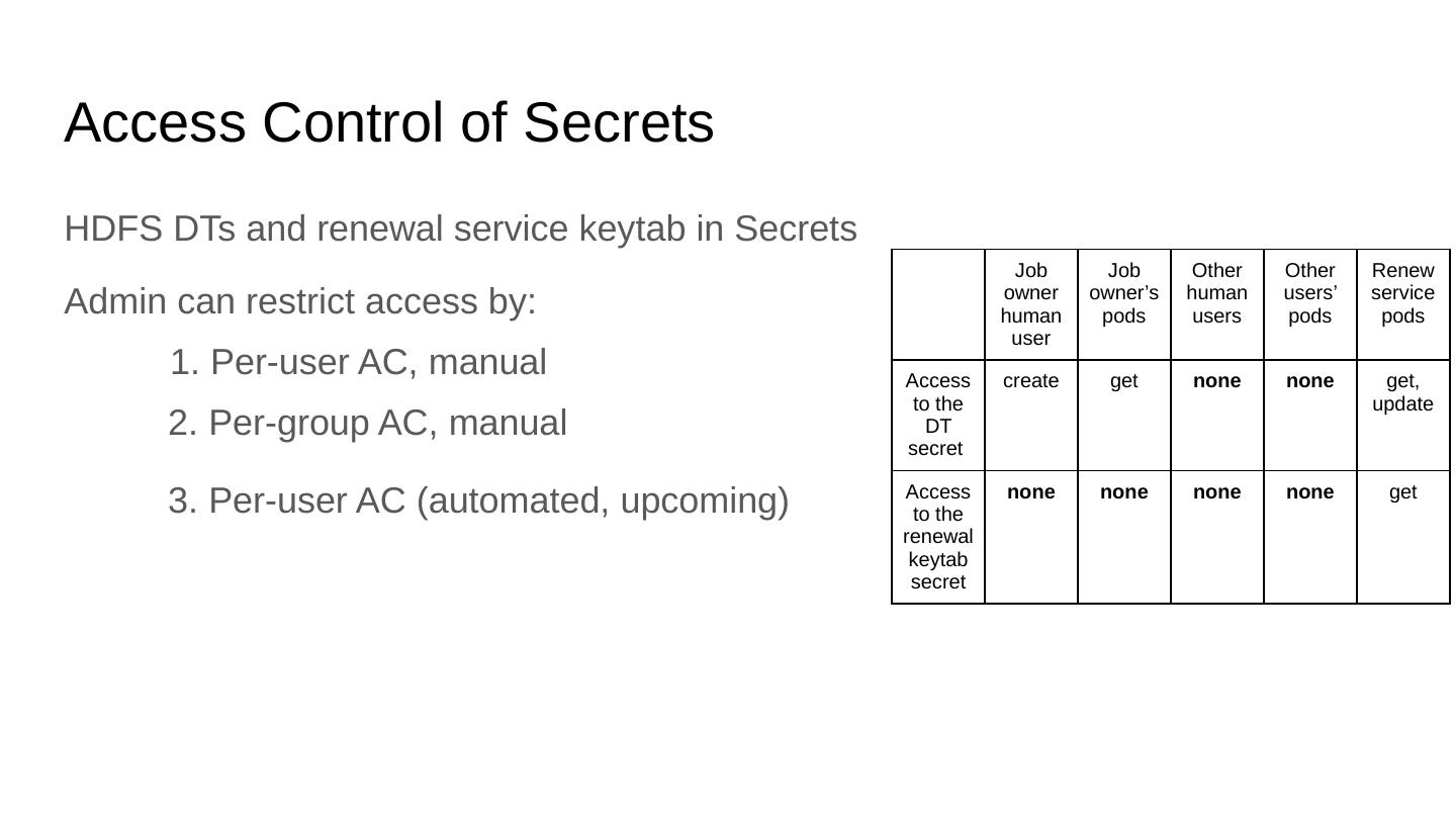 21 .Access Control of Secrets HDFS DTs and renewal service keytab in Secrets Job owner human user Job owner’s pods Other human users Other users’ pods Renew service pods Access to the DT secret create get none none get, update Access to the renewal keytab secret none none none none get Admin can restrict access by: 1. Per-user AC, manual 2. Per-group AC, manual 3. Per-user AC (automated, upcoming)