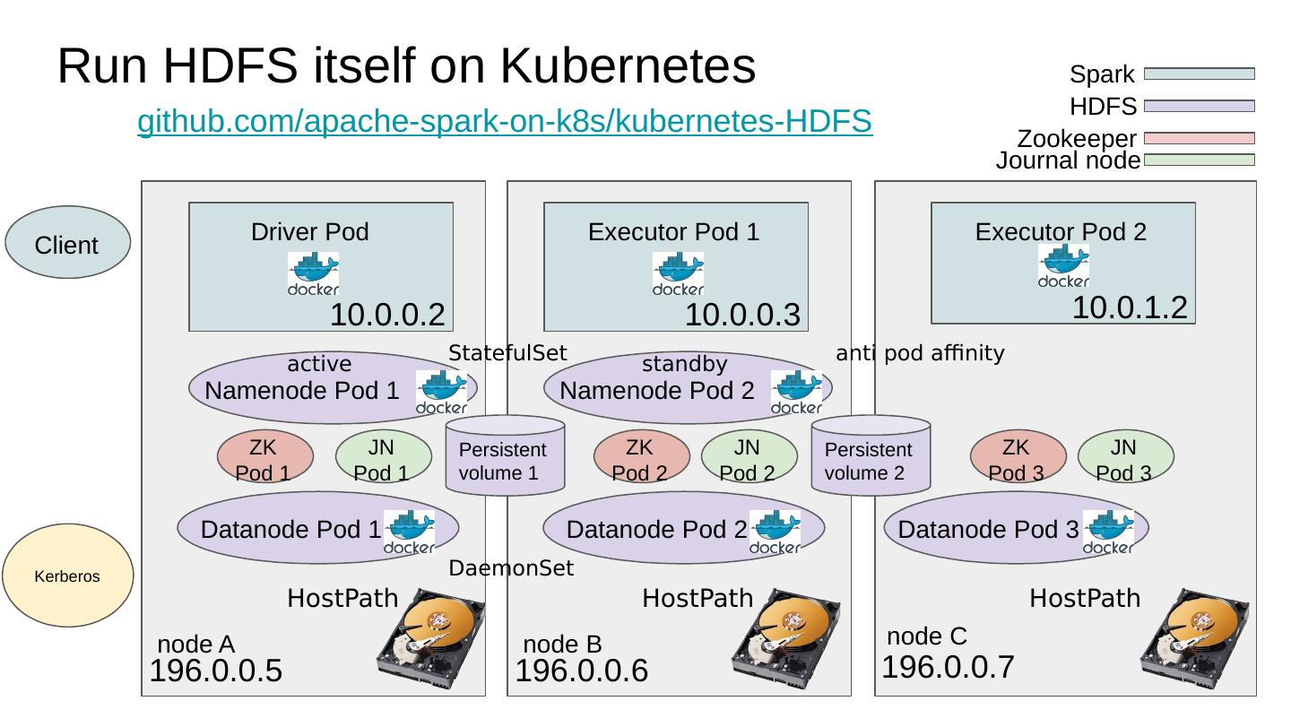 23 .Run HDFS itself on Kubernetes node A node C Driver Pod Executor Pod 2 10.0.0.2 196.0.0.5 196.0.0.7 10.0.1.2 Client Spark Namenode Pod 1 Datanode Pod 1 Datanode Pod 3 HDFS HostPath HostPath github.com/apache-spark-on-k8s/kubernetes-HDFS 196.0.0.6 Executor Pod 1 10.0.0.3 Datanode Pod 2 HostPath Namenode Pod 2 node B Persistent volume 1 Persistent volume 2 ZK Pod 1 ZK Pod 2 JN Pod 1 ZK Pod 3 JN Pod 2 JN Pod 3 Zookeeper Journal node Kerberos StatefulSet DaemonSet active standby anti pod affinity