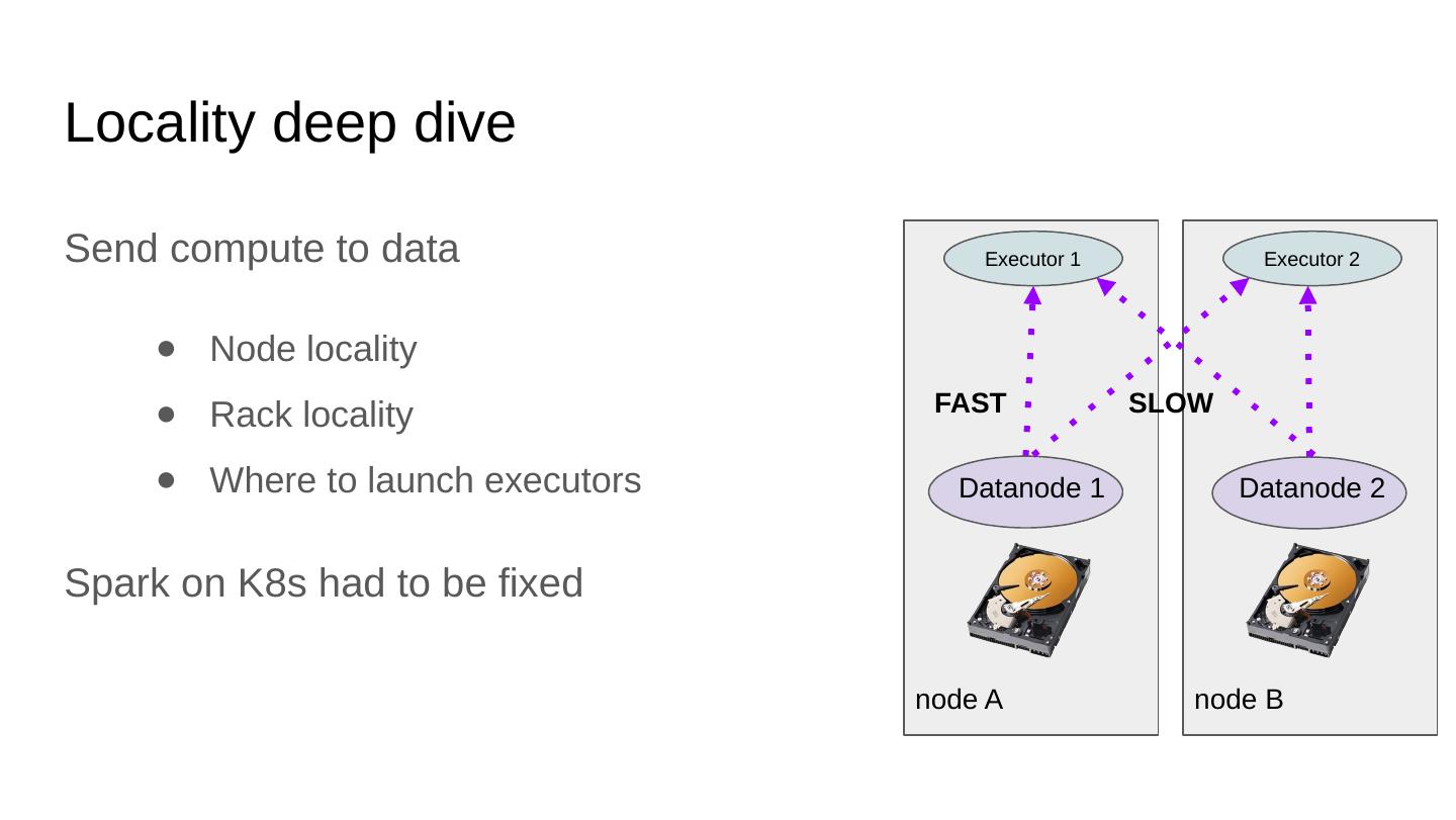24 .Locality deep dive Send compute to data Node locality Rack locality Where to launch executors Spark on K8s had to be fixed Executor 2 node B Executor 1 node A Datanode 1 Datanode 2 SLOW FAST